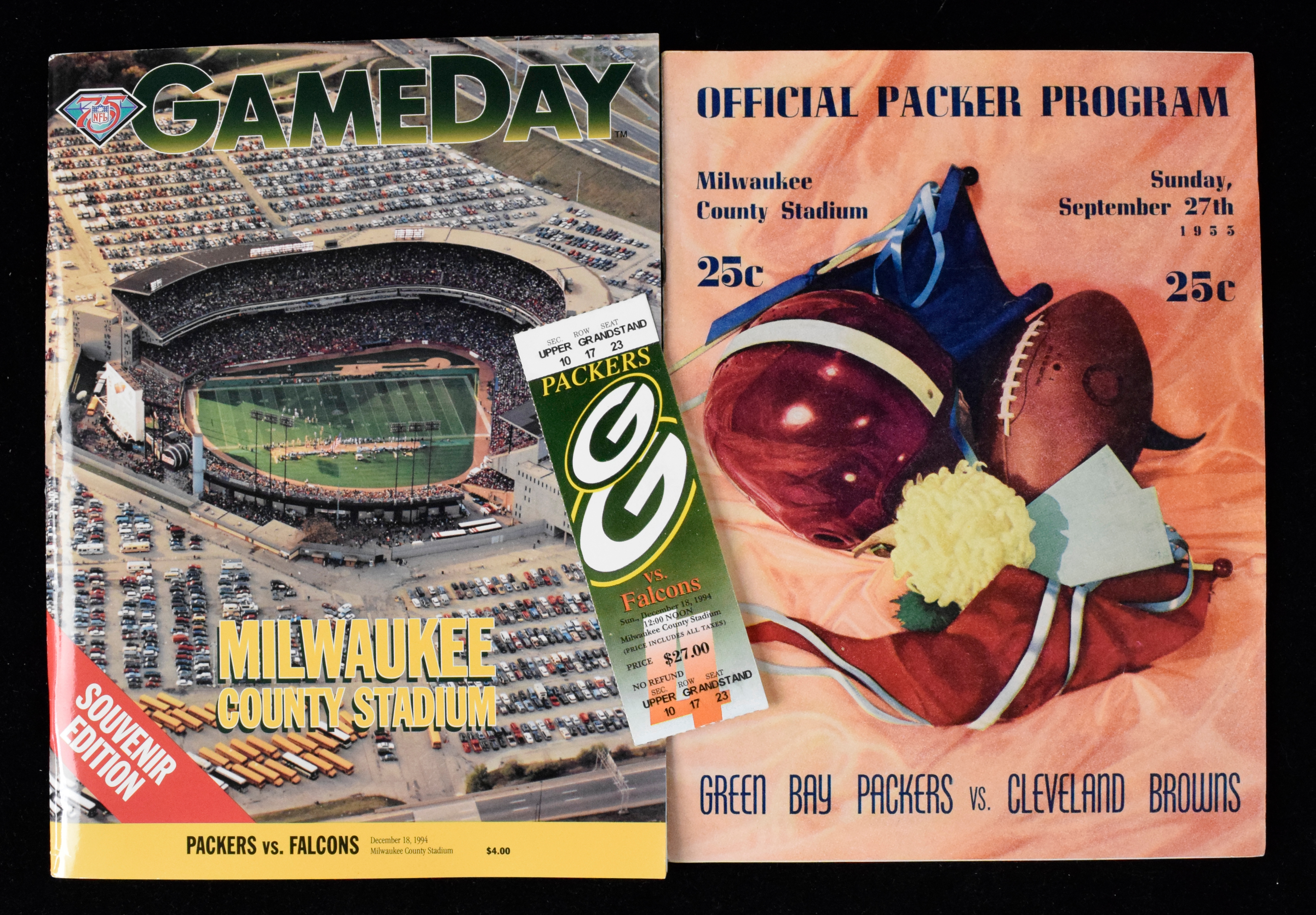 Description:Green Bay Packers 1st & last games at Milwaukee County Stadium programs plus last ticket stub (EX-NM). Includes 9/27/1953 Cleveland Browns at Packers program (EX-EX/MT), 12/18/1994 Atlanta Falcons at Packers ticket stub (EX marks on back) and program (NM).