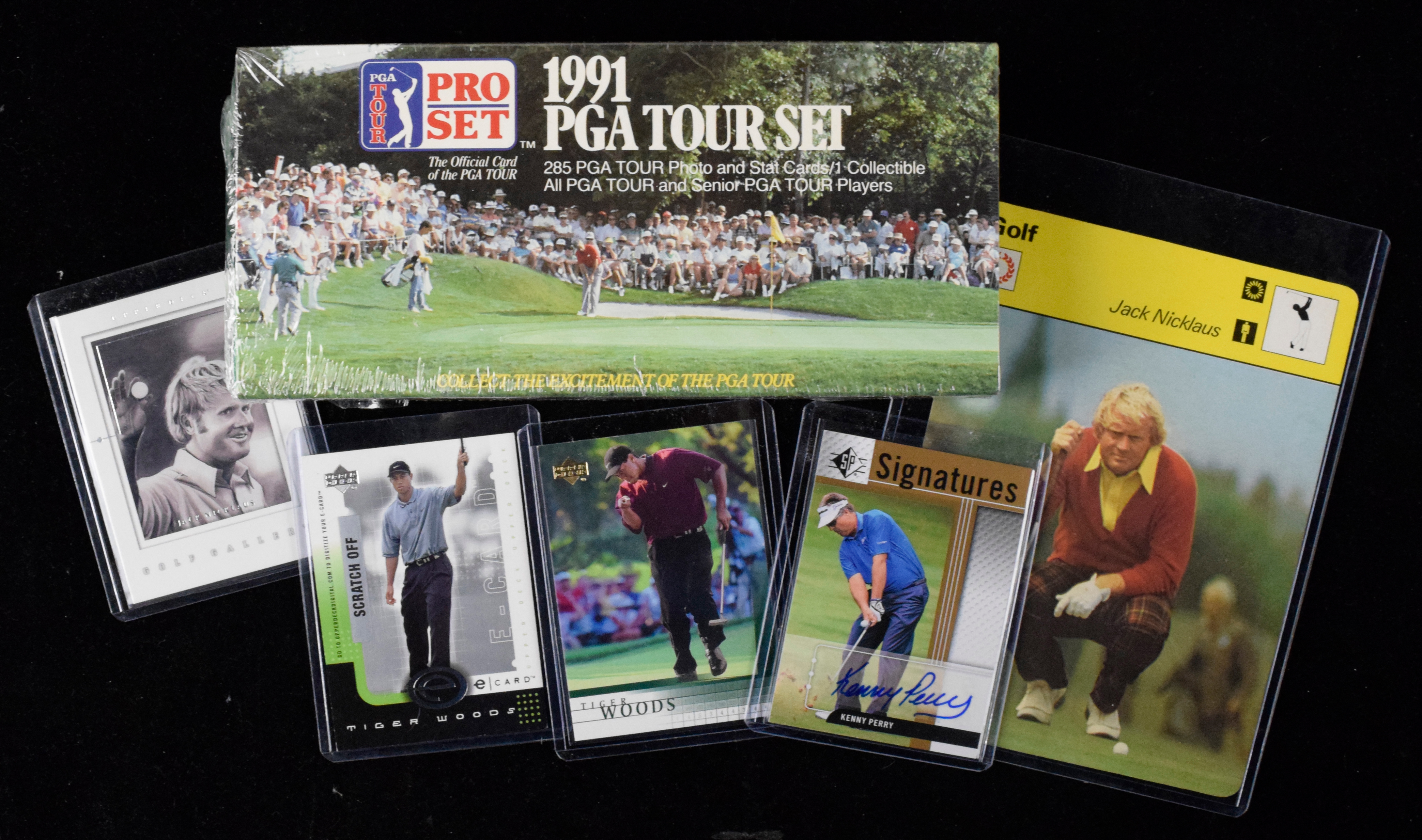 Description:Group of assorted modern golf cards and sets, including Tiger Woods, Jack Nicklaus (NM/MT-MT overall). Lot of assorted golf cards and complete sets is highlighted by (1) 2001 Upper Deck Premiere Edition complete set with #1 Tiger Woods RC; (1) 2001 Upper Deck Legends Jack Nicklaus set; (2) 2001 Tiger's Tales sets; (1) 1991 Pro Set PGA Tour set factory-sealed box; group of 2012 Upper Deck SP golf cards with Kenny Perry autographed card; 1977 Sportscaster Jack Nicklaus card; 2001 Upper Deck SP Fairway Greats cards, including Arnold Palmer, Jack Nicklaus and more, plus other cards and sets. Most appear NM/MT-MT or better.
