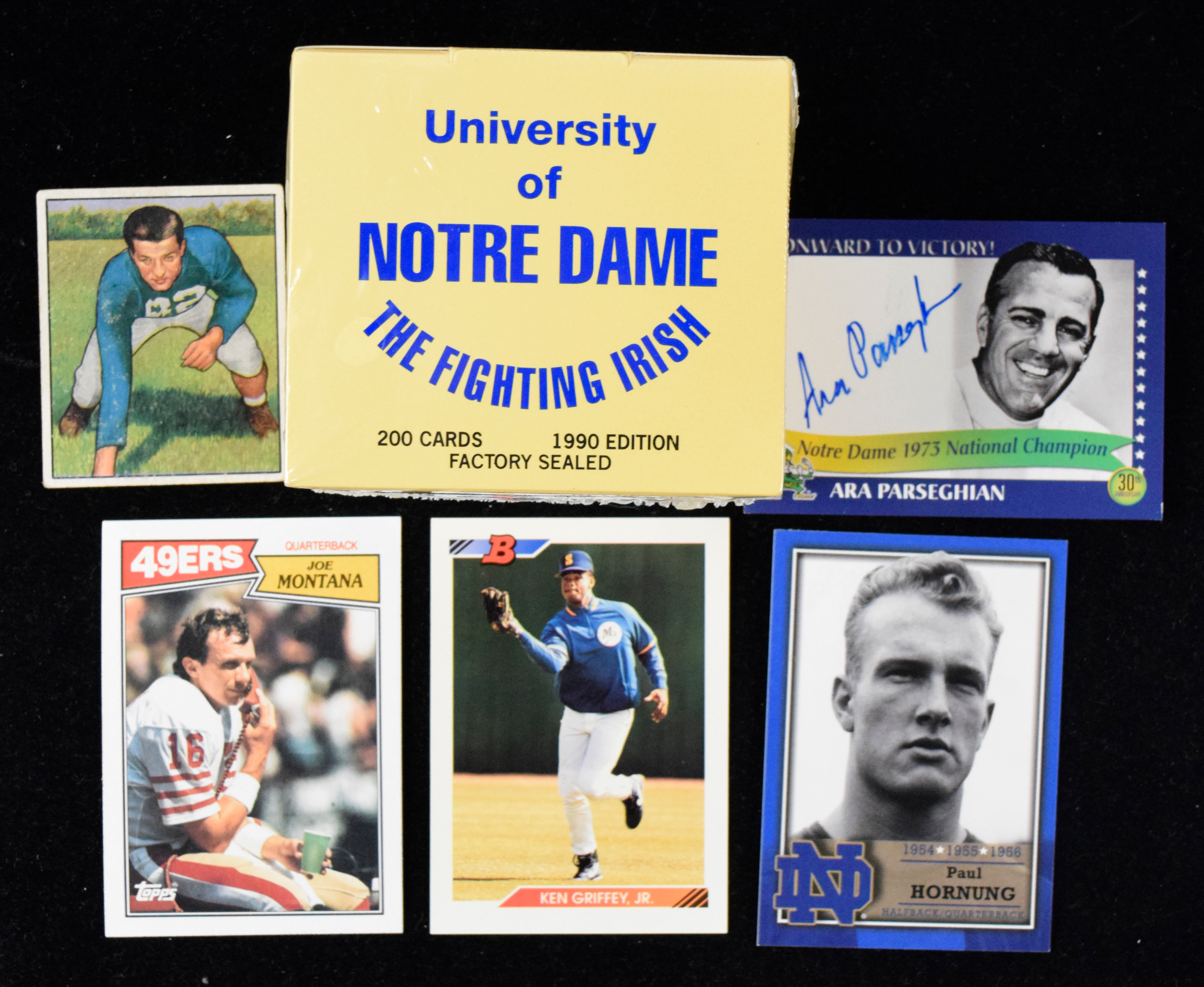 Description:Small group of mostly modern Notre Dame cards, including Ara Parseghian auto (NM/MT-MT overall). Group includes mostly Notre Dame-themed cards or sets with a few others. Highlights include (1) 1950 Bowman #38 Leon Hart (VG/EX); (1) 1990 Notre Dame factory-sealed set (200 cards); (1) 1990 Notre Dame hand-collated set; several Joe Montana cards, including 1987 Topps; 2003 Ara Parseghian autographed card and more; several 1992 Bowman cards, including #100 Ken Griffey Jr. and more. Most appear NM/MT-MT or better.
