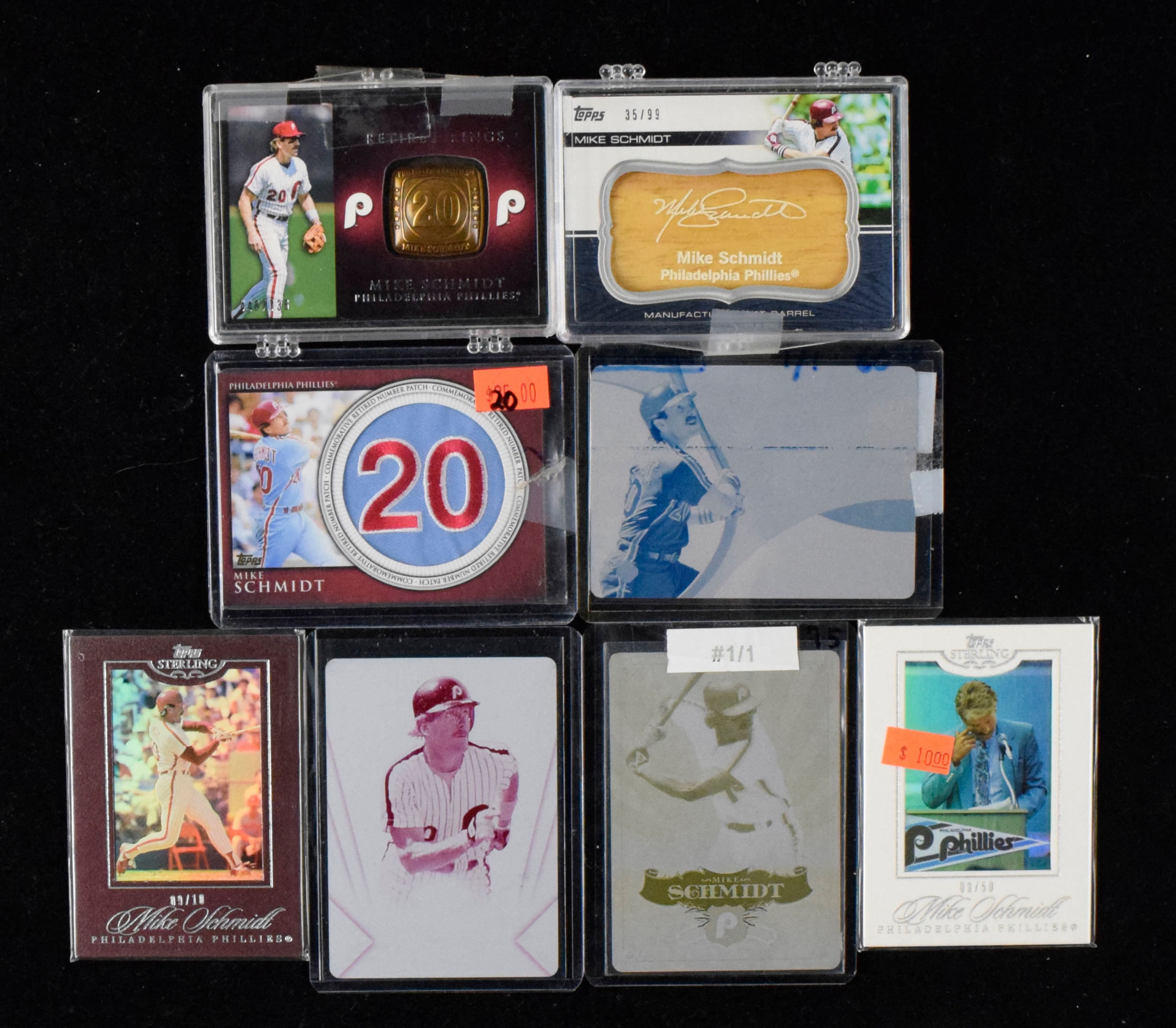 Description:Lot of (350+) mostly modern Mike Schmidt cards with inserts, serial-numbered and relics (MT overall). Assortment of mostly 2000s Mike Schmidt cards features many serial-numbered (including to as low as 1/1 printing plate cards). Brands include Topps (including Sterling), Donruss, Upper Deck and more. Includes many inserts and some relic (non game-used cards). Most appear MT or better.