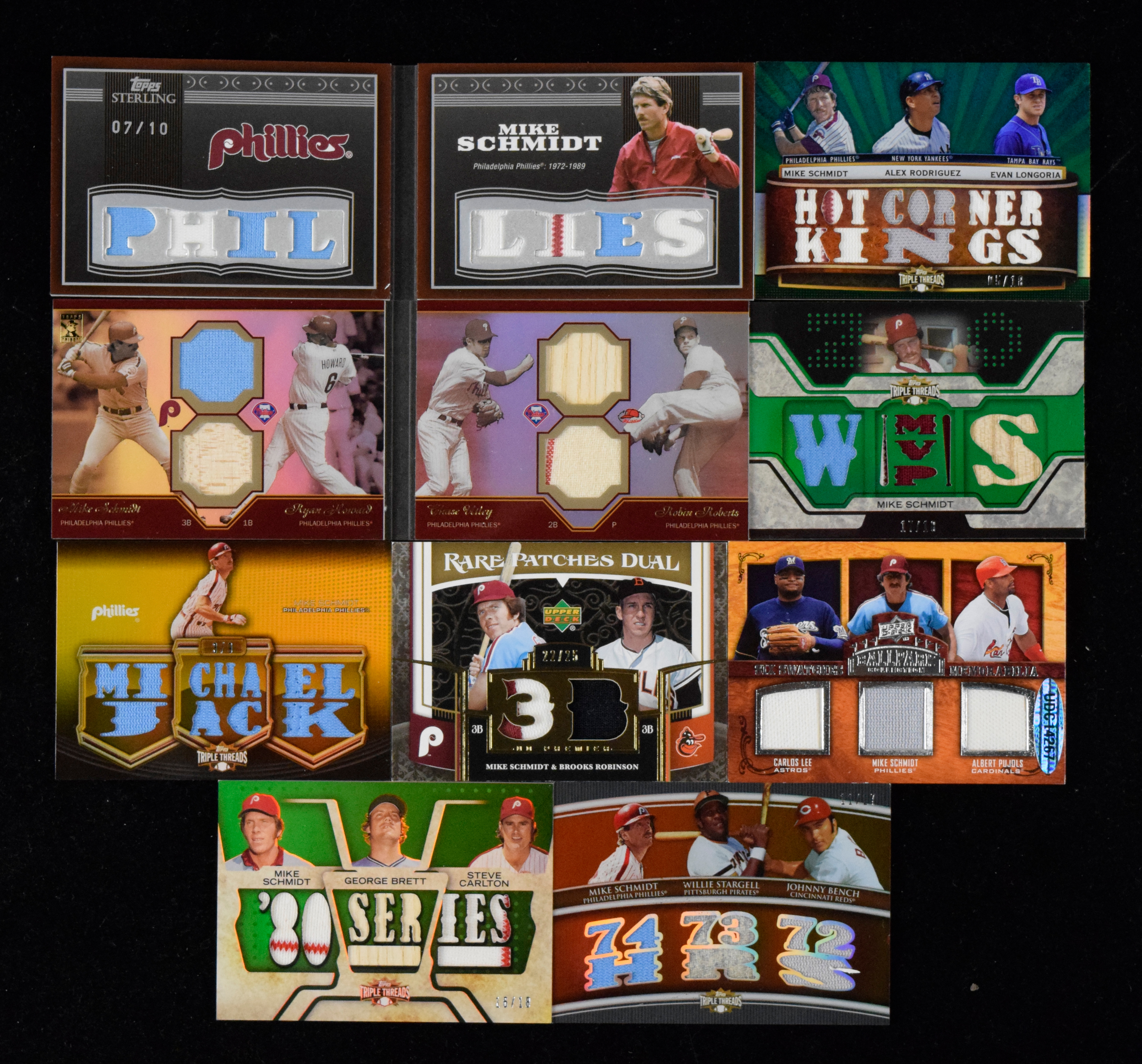 Description:High-end lot of (80) modern Mike Schmidt game-used jersey/bat cards, with Topps Sterling (NM/MT-MT). Very nice lot of modern Mike Schmidt cards, with each featuring a swatch or swatches of game-used memorabilia, including bat and jersey cards, with some with multiple patches, multiple players and most serial-numbered (including to as low as 9). Includes premium brands such as Topps Sterling, Topps Triple Threads, Upper Deck Sweet Spot, Topps Tribute and more. Most appear NM/MT-MT or better.