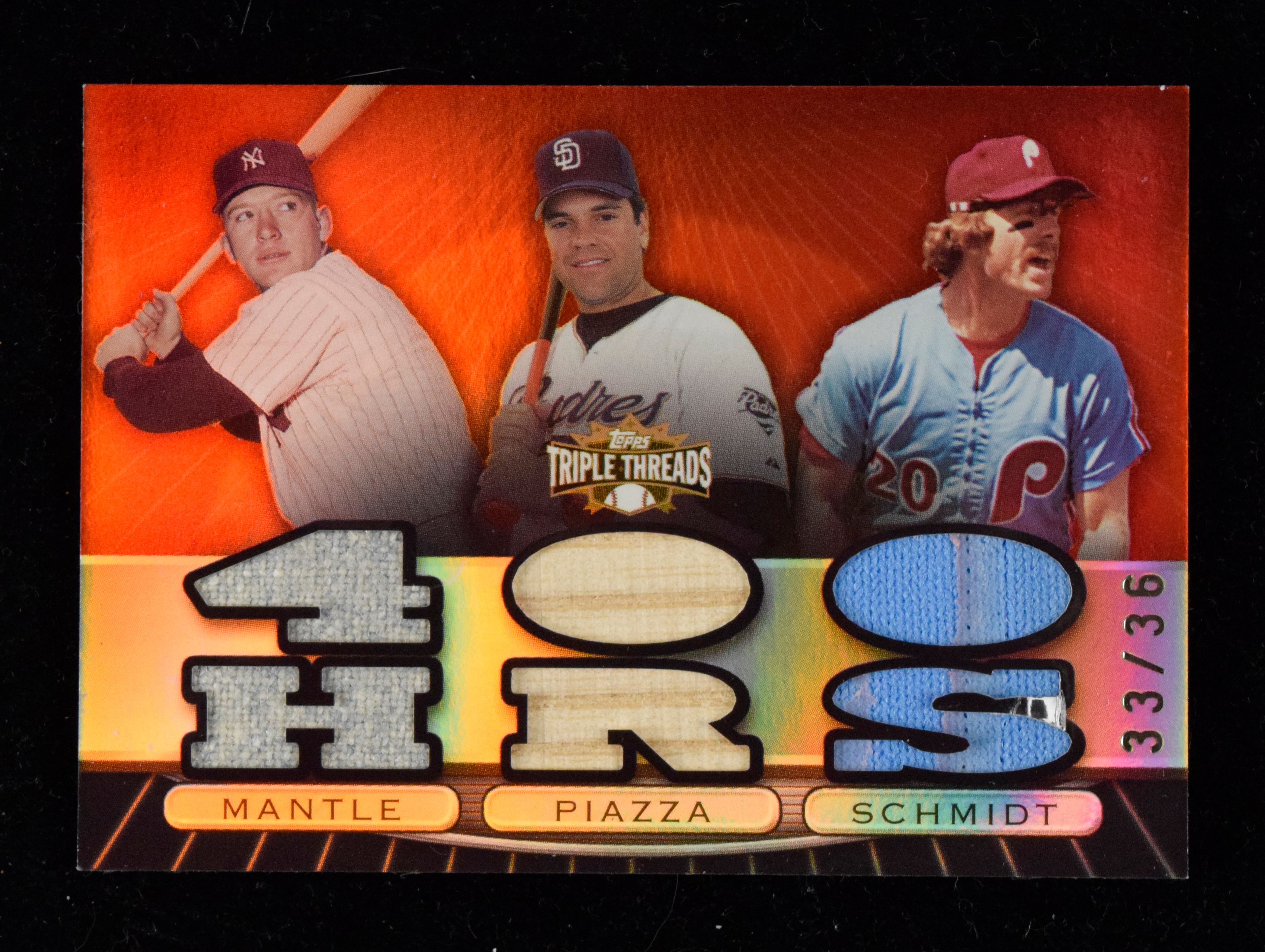 Description:2007 Topps Triple Threads Relics Combos with Mantle, Piazza and Schmidt GU swatches (33/36; NM/MT). Tough card from 2007 Topps Triple Threads Relics Combos, featuring a pants swatch from Mickey Mantle, jersey swatch from Mike Schmidt and piece of bat from Mike Piazza. Card is numbered 33/36 on the front and appears NM/MT.