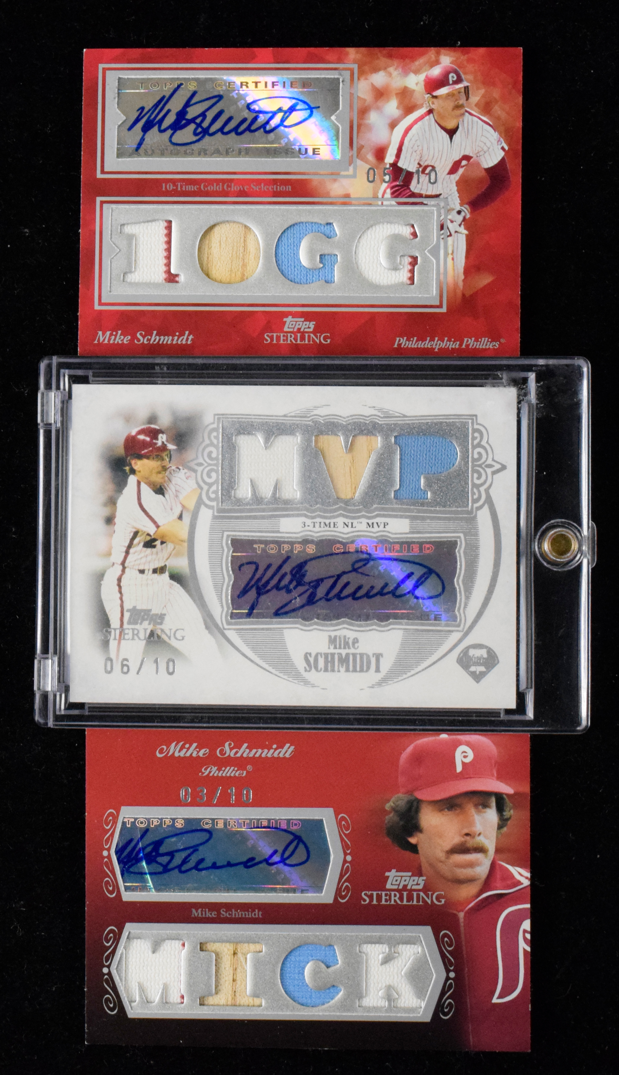 Description:Lot of (3) 2007-2008 Topps Sterling Mike Schmidt autographed relic cards, each #d to 10 (MT). Premium lot of Topps Sterling Mike Schmidt certified autograph cards, with (1) 2007 Topps Sterling triple relic autographed card (6/10); and (2) 2008 Topps Sterling quad relic autographed cards (3/10 & 5/10). Signatures rate 9/10 out of 10, and cards appear MT.