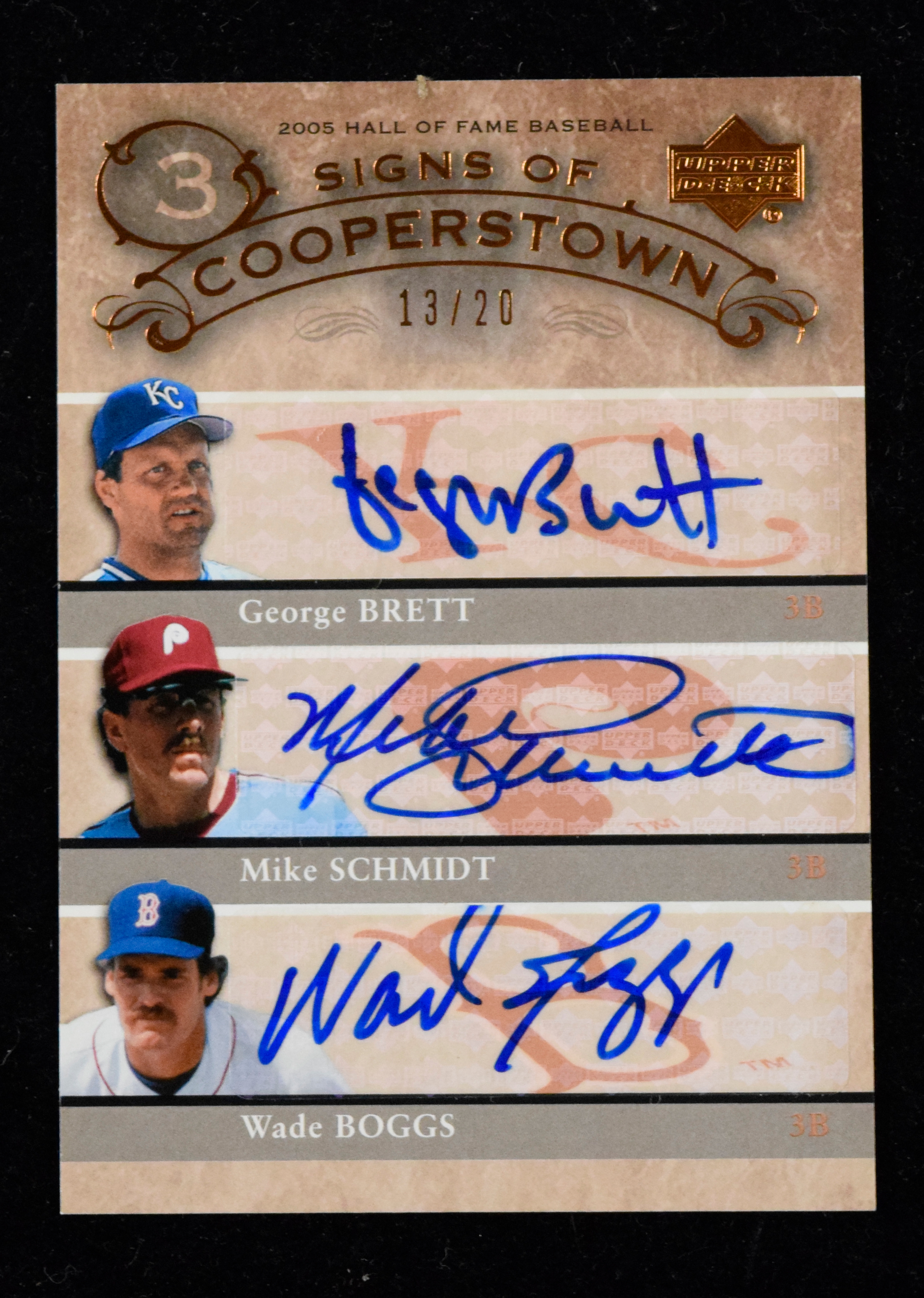 Description:2005 Upper Deck Hall of Fame triple autograph card with Brett, Schmidt & Boggs (MT). Tough Signs of Cooperstown card is numbered 13/20 on the front and signed in blue ink by George Brett, Mike Schmidt and Wade Boggs. Signatures rate 9/10 out of 10, and card appears MT.