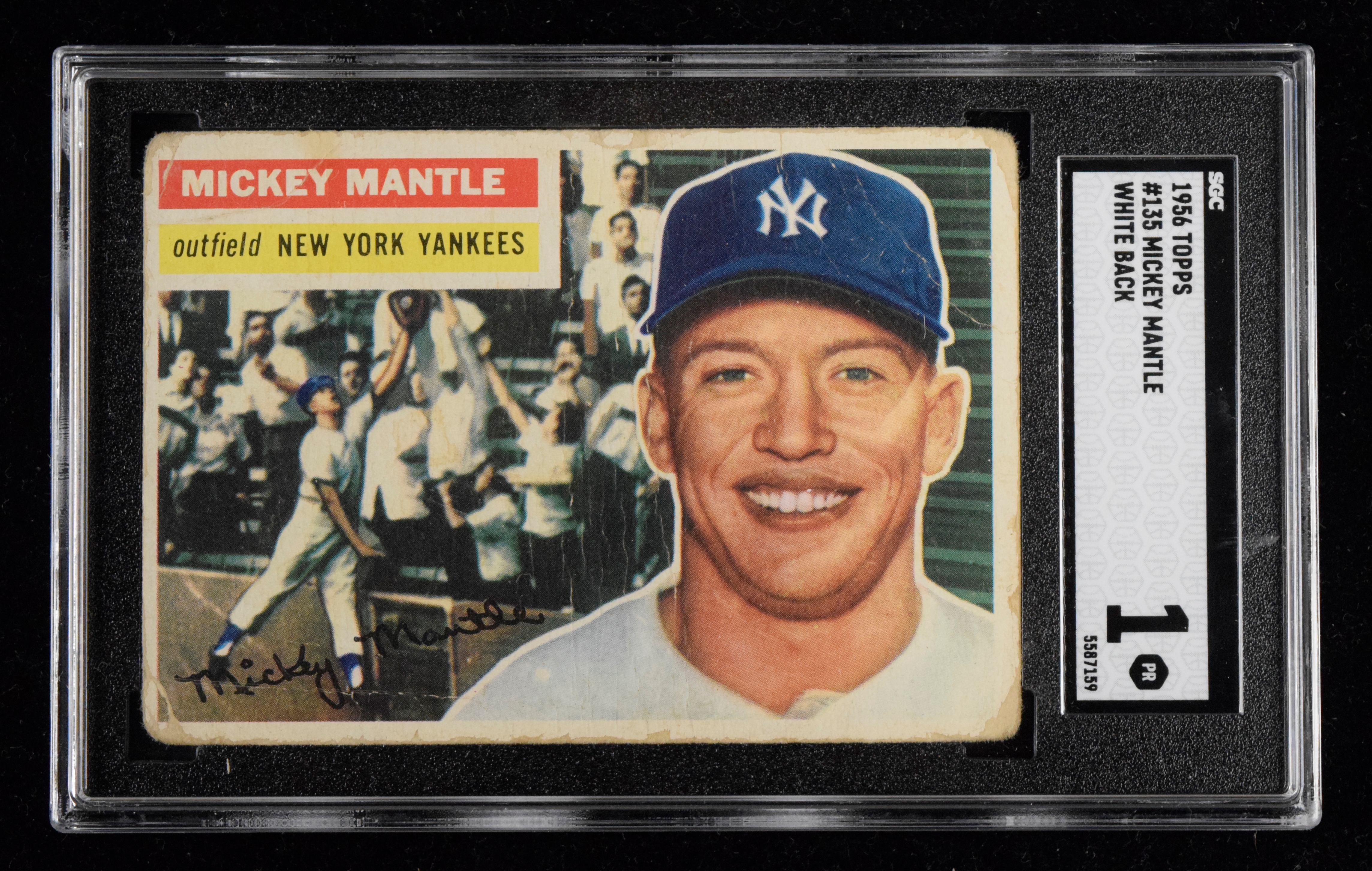 Description:1956 Topps #135 Mickey Mantle white back (SGC 1 PR). Well-worn copy from Mantle's triple crown year exhibits heavy creases vertically through the center as well as the upper right, along with four rounded corners (with paper loss) and edge damage. White back is relatively clean: SGC 1 PR. ($400-$600)