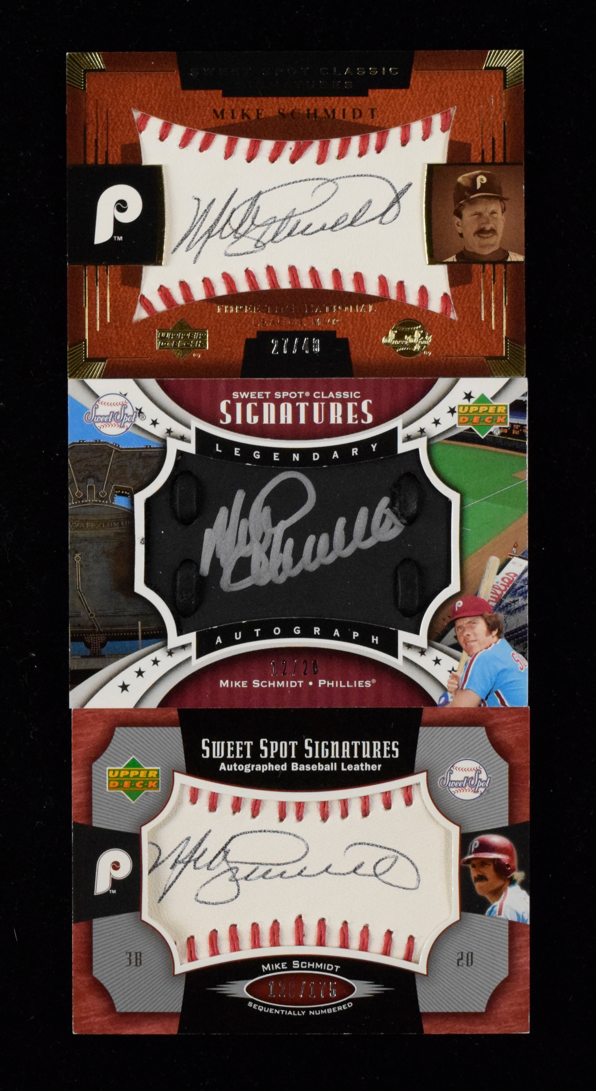 Description:Lot of (3) 2004-2007 Upper Deck Sweet Spot Signatures Mike Schmidt autographed cards (MT). Cards have embedded baseball material autographed by Mike Schmidt. Includes (1) 2004 Sweet Spot Signatures (27/40); (1) 2005 Sweet Spot Signatures (129/175) and (1) 2007 Sweet Spot Signatures (12/20). Signatures rate 8/9 out of 10, and cards appear MT.