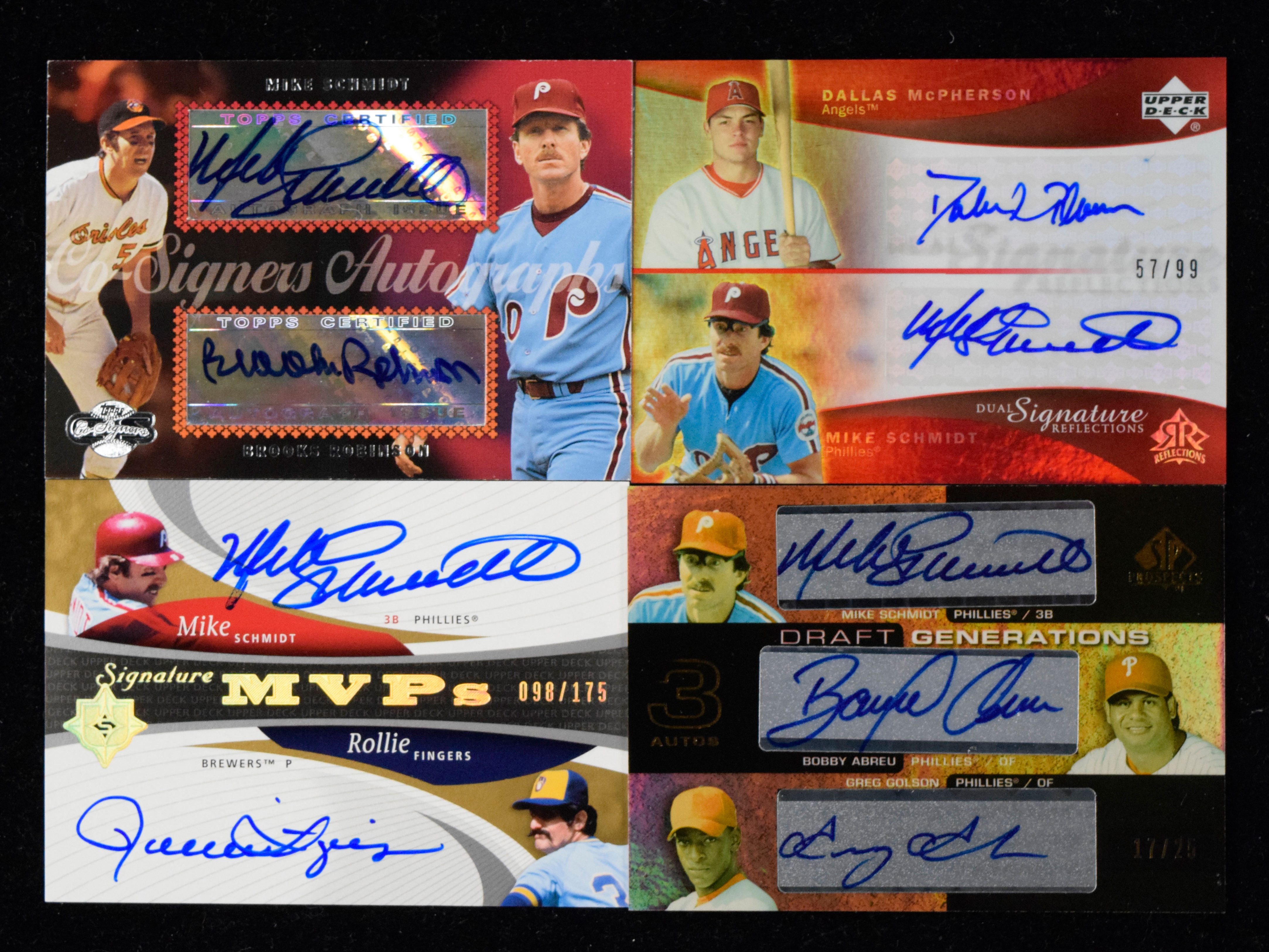 Description:Lot of (4) multi-signed certified autograph cards, including Mike Schmidt and Brooks Robinson (MT). Includes (1) 2005 Upper Deck Ultimate Signature Edition Mike Schmidt and Rollie Fingers dual autographed card (98/175); (1) 2005 Upper Deck Dual Signature Reflections Mike Schmidt and Dallas McPherson dual autographed card (57/99); (1) 2004 SP Prospects Mike Schmidt, Bobby Abreu and Greg Golson triple autographed card (17/25) and (1) 2006 Topps Co-Signers Mike Schmidt and Brooks Robinson dual-autographed card. Signatures rate 9/10 out of 10, and cards appear MT.