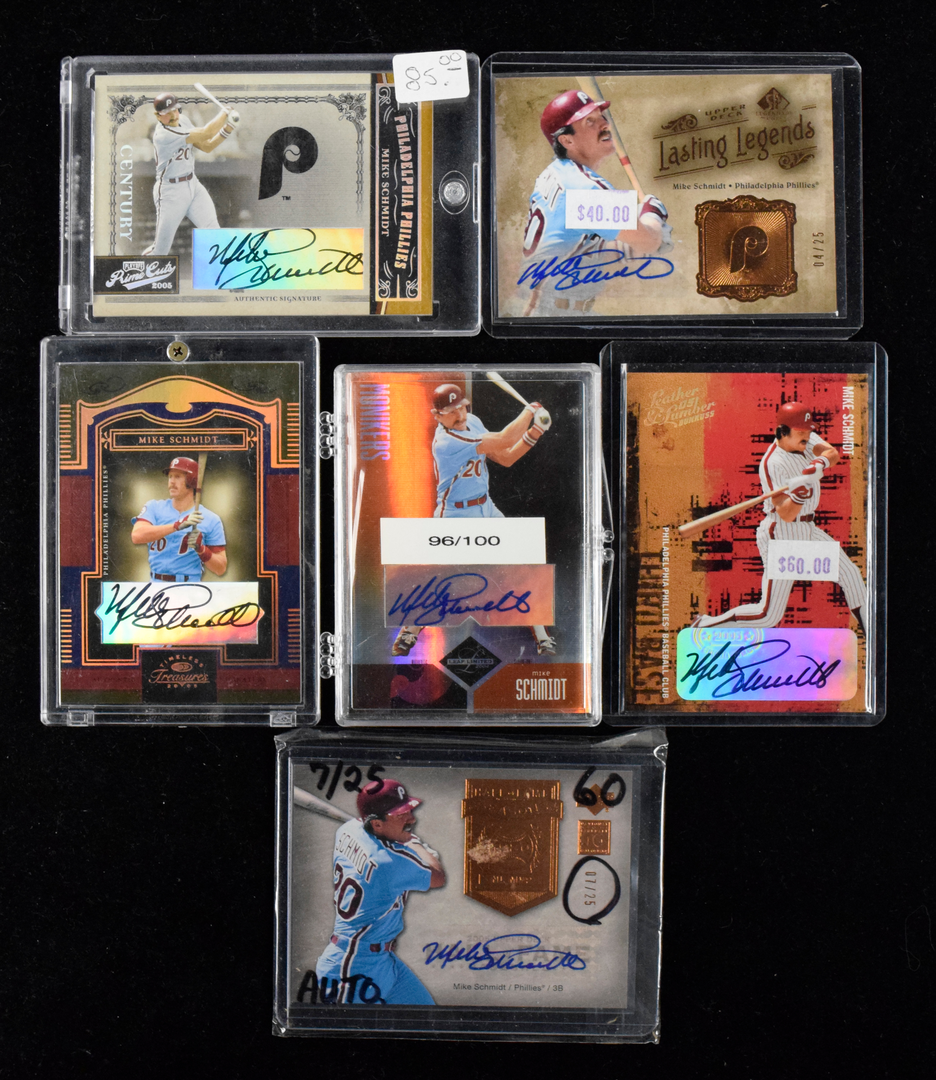 Description:Lot of (10) Mike Schmidt mid-2000s certified autograph cards with some numbered (NM/MT-MT). Each Mike Schmidt card is a pack-pulled certified autograph card, with some serial-numbered. Brands include Topps, Upper Deck, Leaf Limited, Playoff Prime Cuts and more. Signatures rate 9/10 out of 10, and cards appear NM/MT-MT or better.