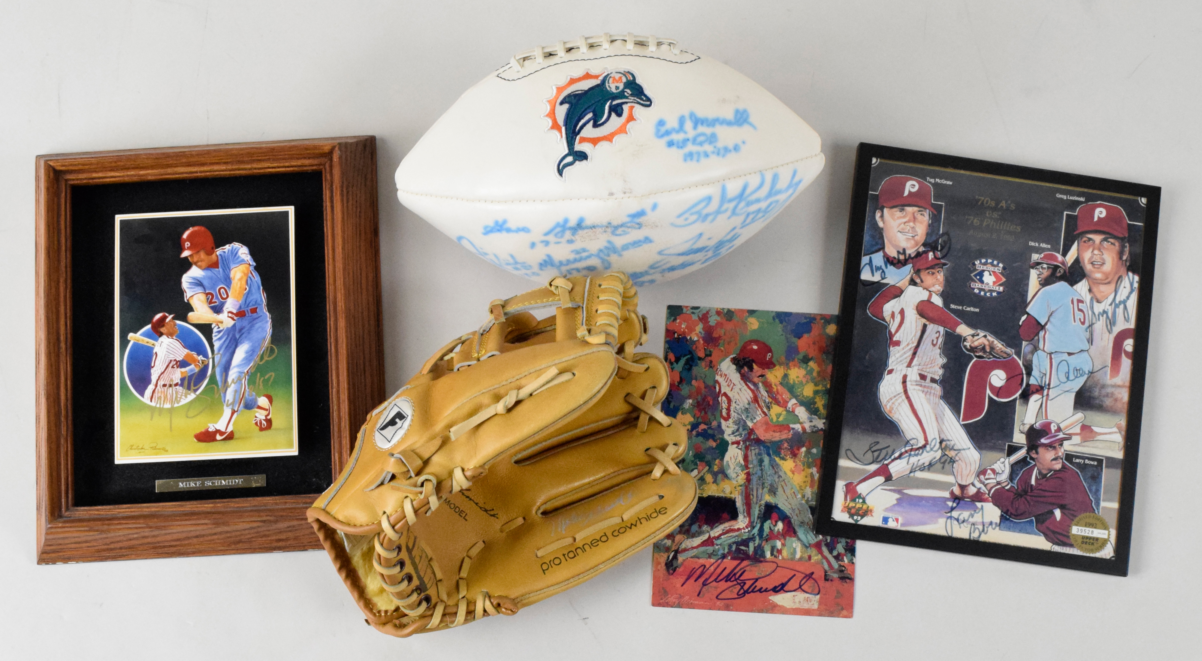 Description:Lot of (8) autographed items with many Phillies and Dolphins football (Sigs. EX-MT). Assortment of autographed items includes (1) Dolphins logo football signed by (6): Garo Yepremian, Larry Little, Jim Langer, Mercury Morris, Jim Kiick and Bob Kuchenberg (signatures blurred with ink bleed; ball mostly deflated); (1) Franklin Mike Schmidt model glove for right-handed thrower signed by Schmidt; (1) framed 8"x10" print signed by Tug McGraw, Greg Luzinski, Dick Allen, Steve Carlton and Larry Bowa; (1) framed 8"x10" print signed by Schmidt, Joe Morgan, Gary Mathews, John Denny and Al Holland; (1) 12"x10" 1988 Gartland ceramic art display signed by Schmidt with 4/18/87 inscription; (1) 8 1/2"x 5 1/2" LeRoy Neiman print signed by Schmidt; (1) medication fact card signed by Schmidt and (1) 12"x14" print signed by Schmidt and Carlton. Signatures range from 7 to 9 (avg. 8) out of 10, and items range VG-NM.5