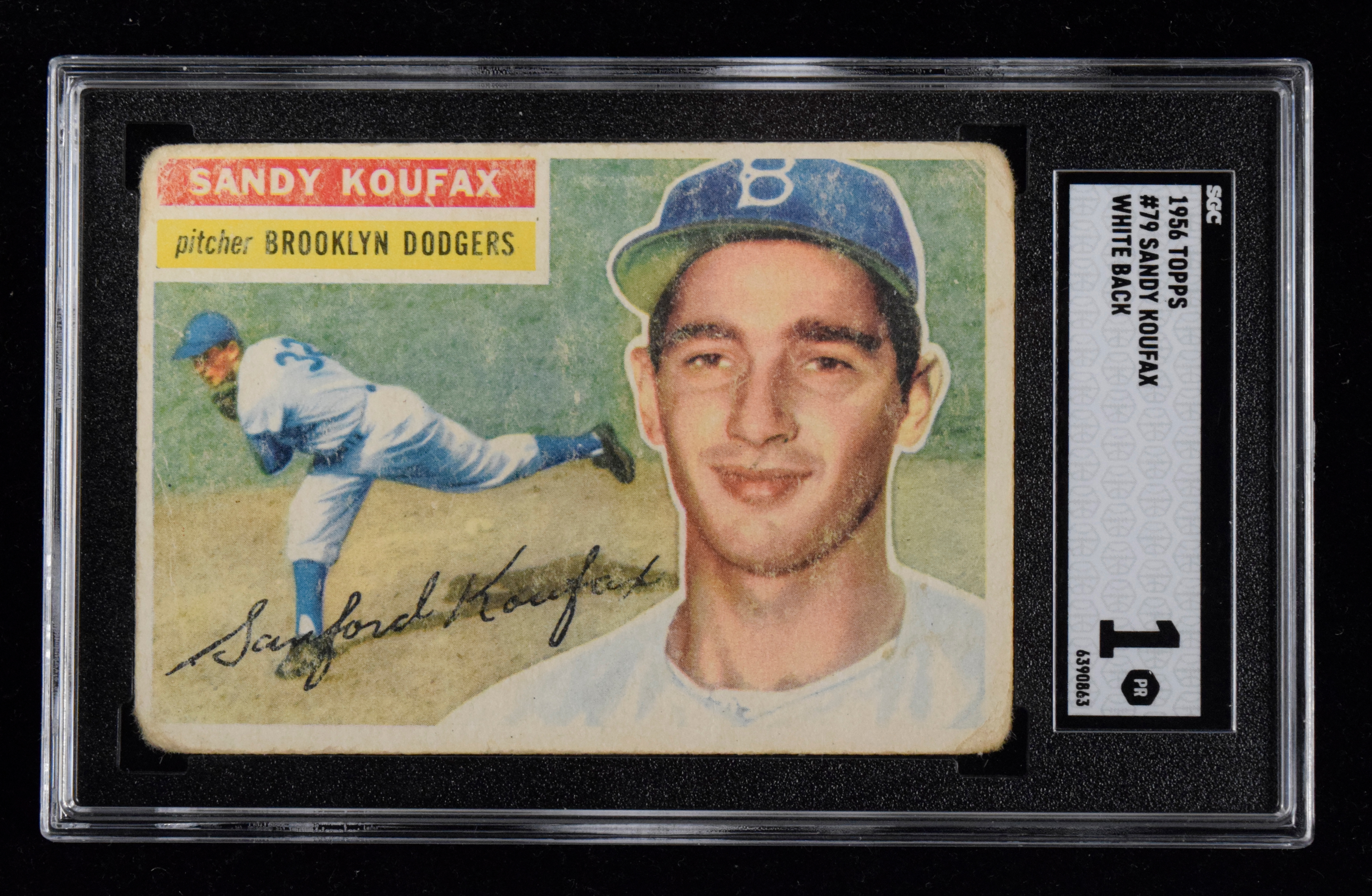 Description:1956 Topps #79 Sandy Koufax white back (SGC 1 PR). Well-worn copy exhibits four rounded corners and heavy surface wear. White back is relatively clean: SGC 1 PR.