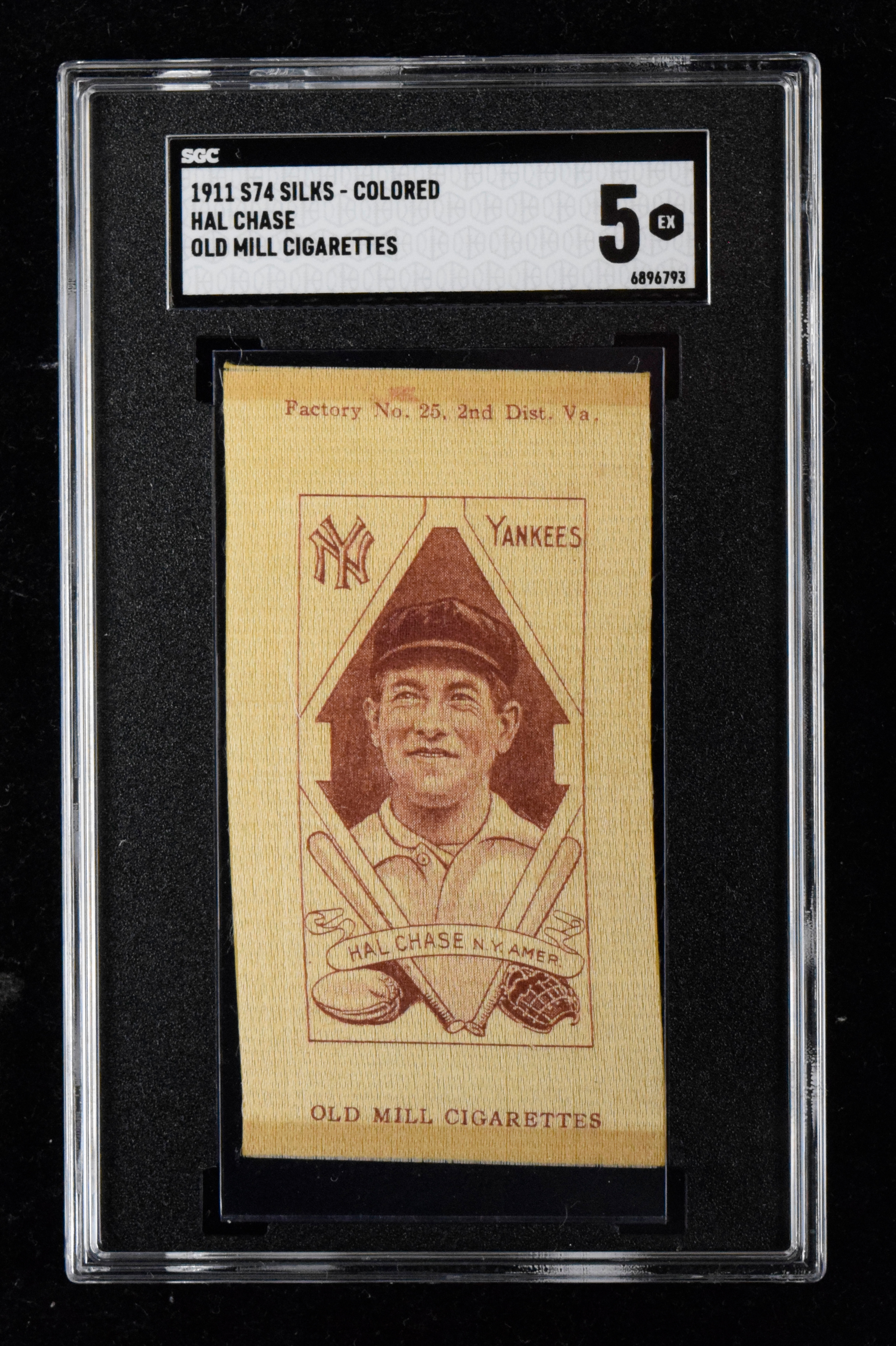 Description:1911 S74 Colored Silks Hal Chase, Old Mill Cigarettes (SGC 5 EX; pop 2 with one higher). Very nice Colored Silk (Old Mill Cigarettes) featuring Hal Chase has just a tiny area of fraying in the upper left corner, with a few areas of toning/spotting on the reverse. Silk is one of only (2) Old Mill Chases graded a 5 by SGC, with only one copy higher: SGC 5 EX.