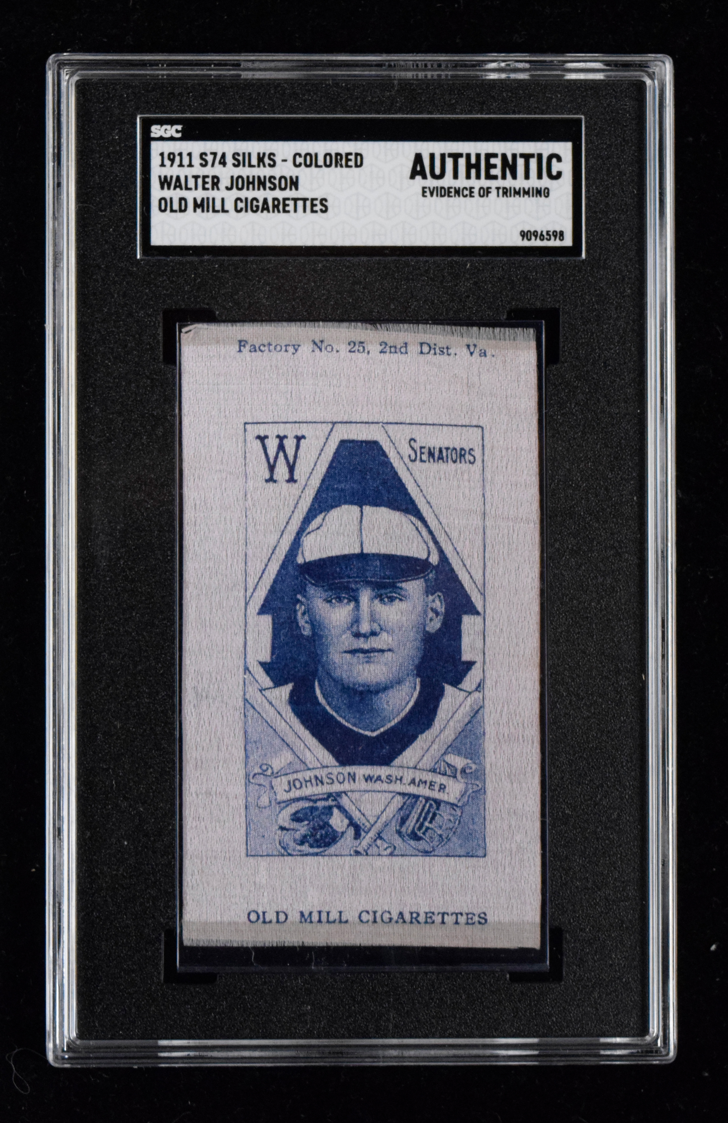 Description:1911 S74 Colored Silks Walter Johnson, Old Mill Cigarettes (SGC Authentic; evid. trim). Nice eye-appeal silk of the Hall of Famer Walter Johnson has been flagged by SGC as "Authentic; Evidence of Trimming" due to what appears to be irregular cuts on the top and bottom edges. Silk otherwise has a VG/EX appearance: SGC Authentic; Evidence of Trimming.