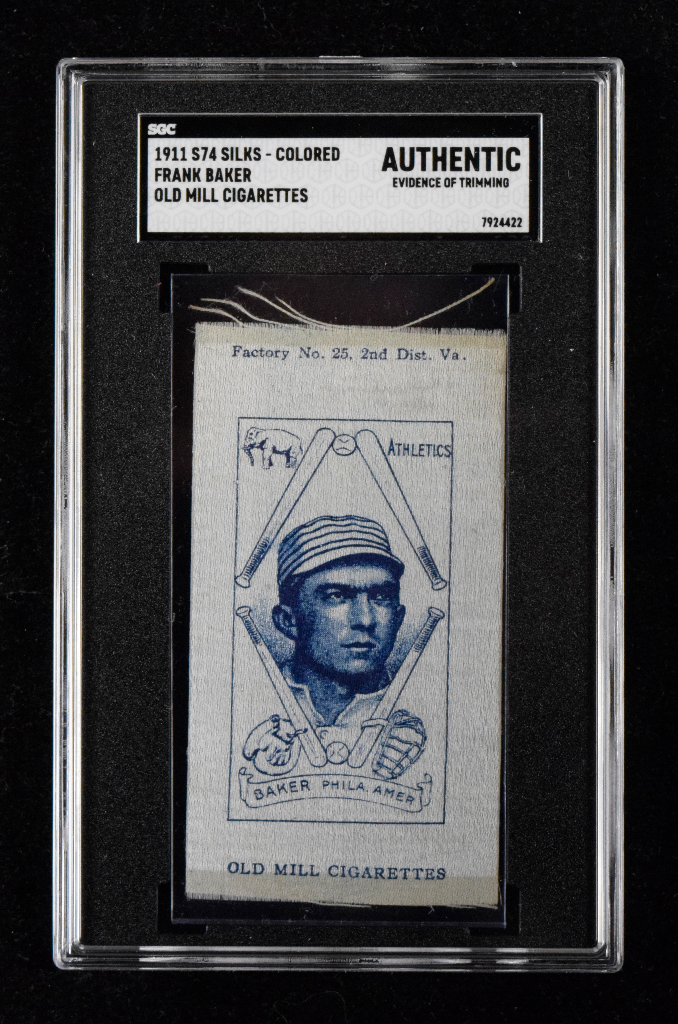 Description:1911 S74 Colored Silks Frank Baker, Old Mill Cigarettes (SGC Authentic; evid. trim). Nice eye-appeal silk of the Hall of Famer Frank Baker has been flagged by SGC as "Authentic; Evidence of Trimming" due to what appears to be irregular cuts on the top and bottom edges. Silk otherwise has a VG appearance: SGC Authentic; Evidence of Trimming.