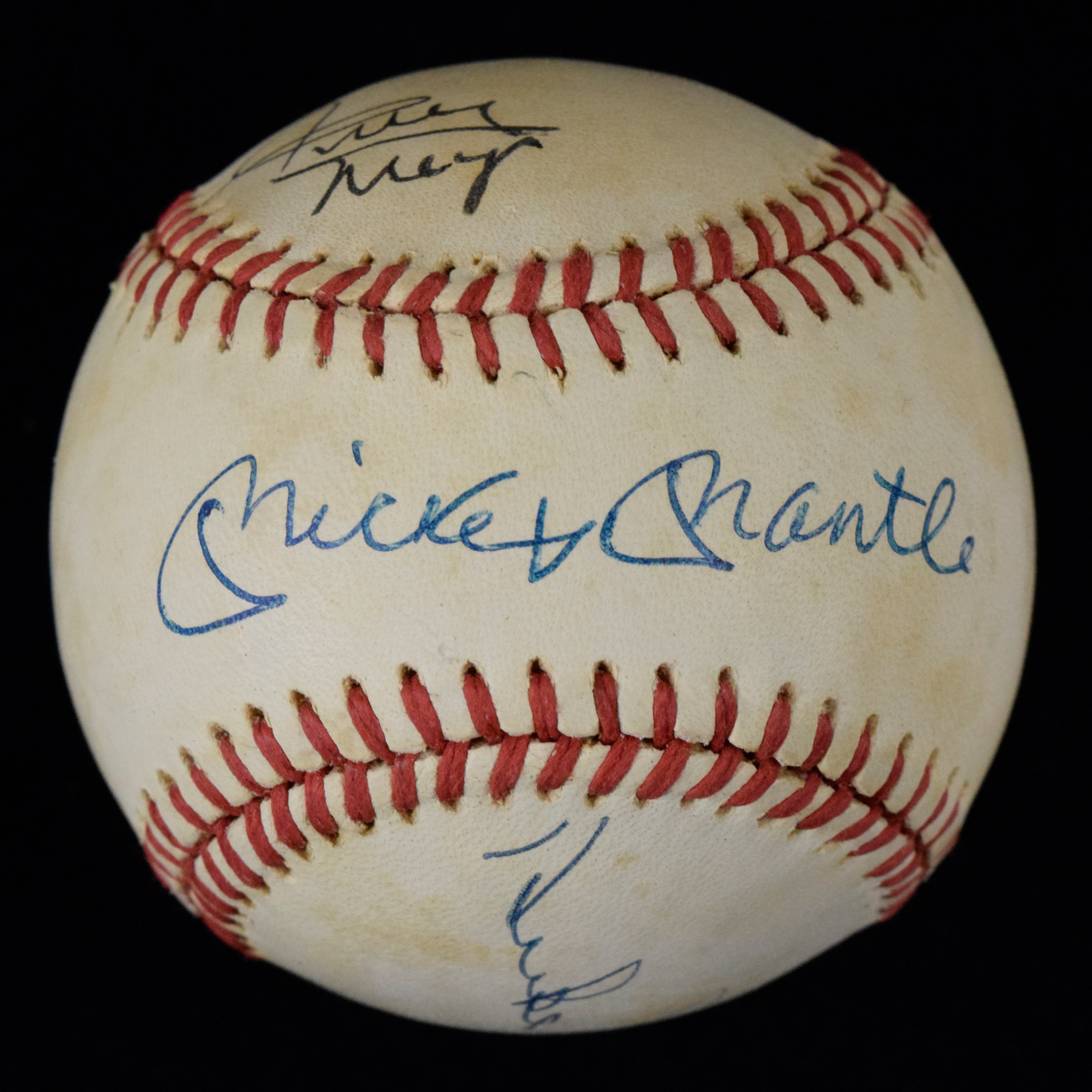 Description:Mickey Mantle, Willie Mays & Duke Snider autographed B. Giamatti baseball (Sigs. MT). B. Giamatti N.L. baseball has been signed on the sweet spot by Mickey Mantle, with additional side panel signatures from Willie Mays and Duke Snider. Signatures rate 9 out of 10, and ball has moderate toning/spotting: VG/EX. ($500-$750)