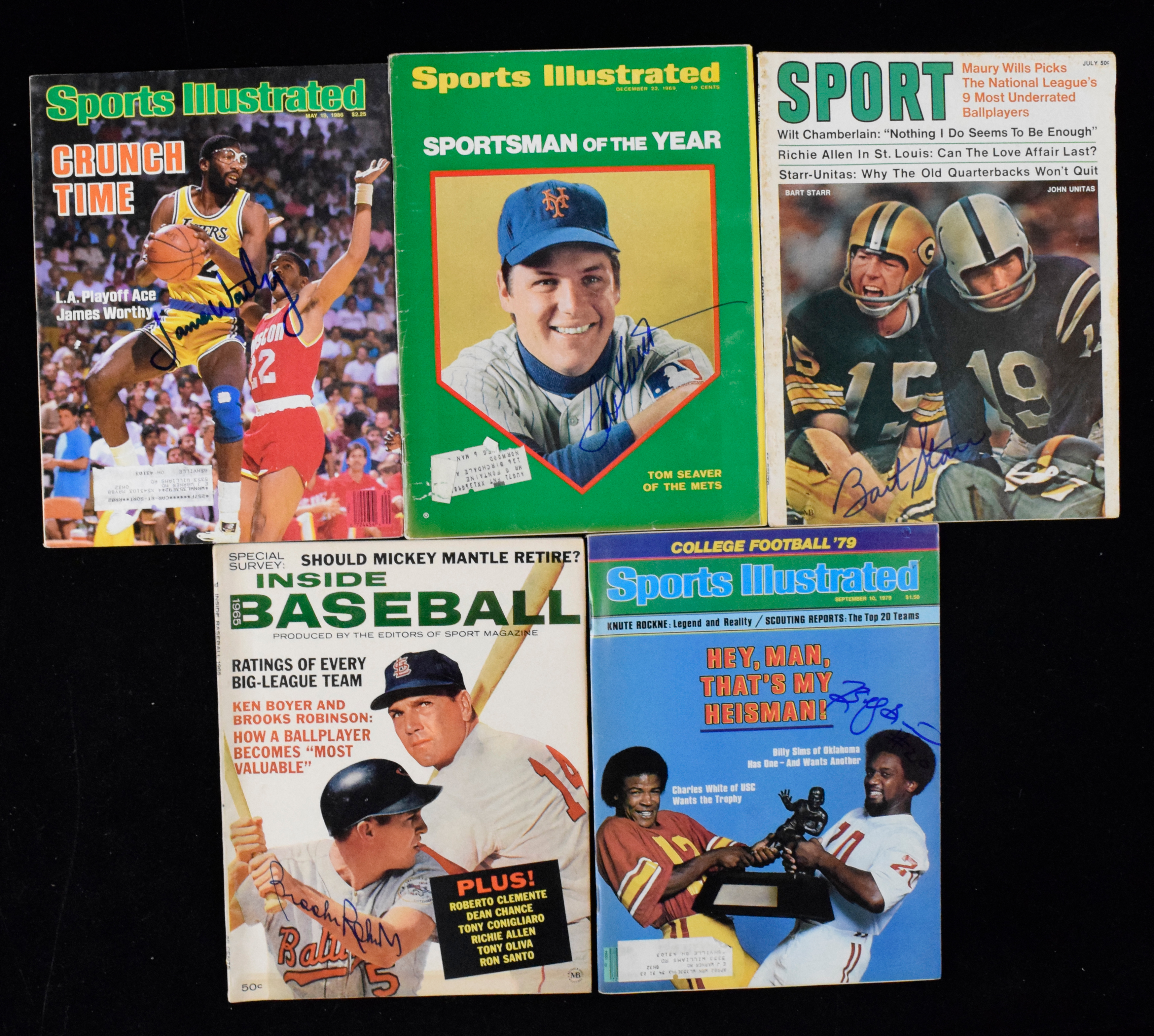 Description:Multi-sport lot of (5) autographed magazines, with Starr, Seaver and Worthy (Sigs. MT). Assortment of signed magazines includes (1) 1979 Sports Illustrated signed by Billy Sims; (1) 1970 Sport magazine signed by Bart Starr; (1) 1986 Sports Illustrated signed by James Worthy; (1) 1965 Inside Baseball signed by Brooks Robinson; and (1) 1969 Sports Illustrated signed by Tom Seaver. Signatures rate 9/10 out of 10 and magazines range VG/EX-EX/MT.