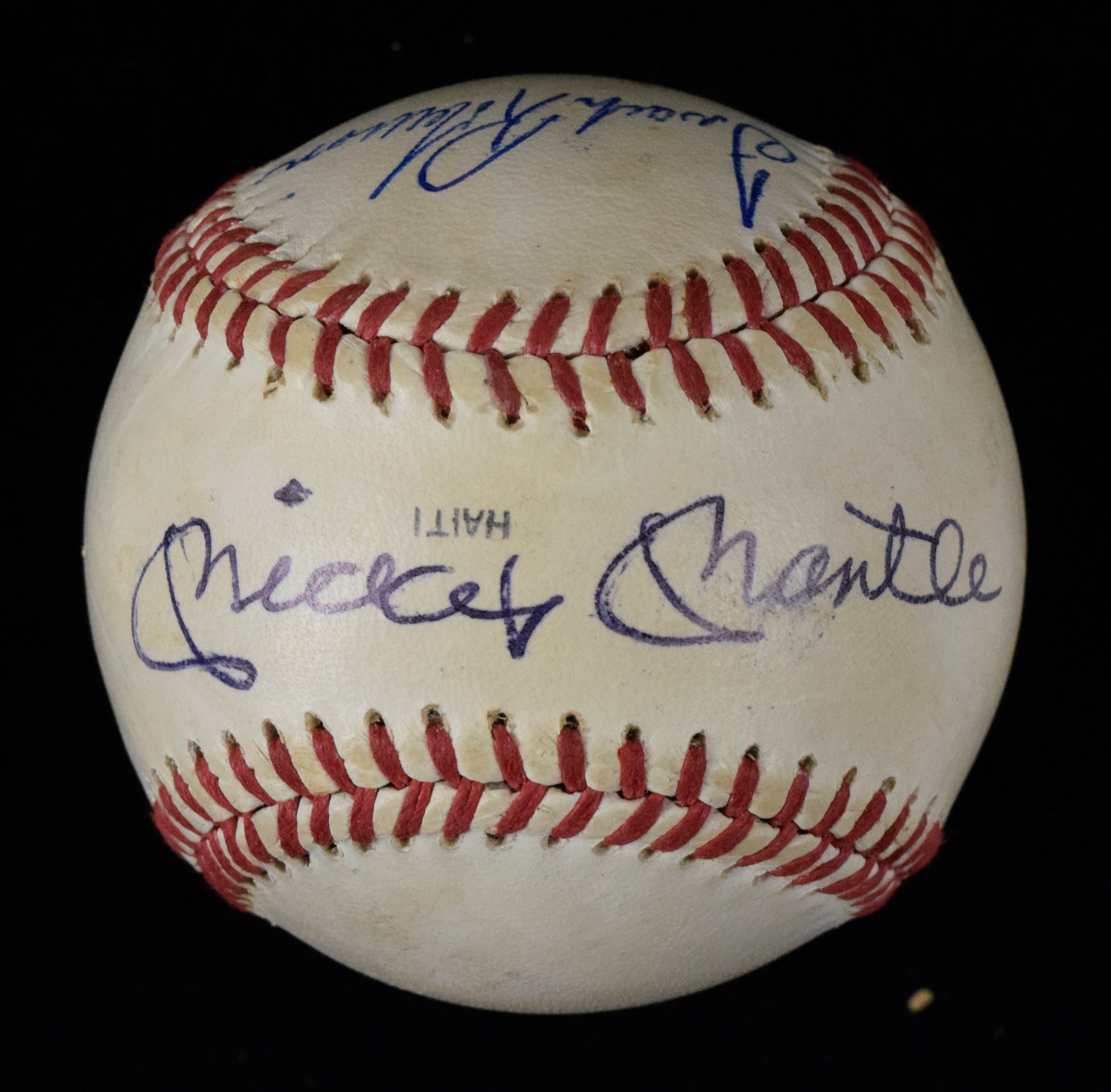 Description:Mickey Mantle and Frank Robinson autographed Worth baseball (Sigs. NM/MT-MT). Worth Official League baseball has been signed on the sweet spot by Mickey Mantle, and on a side panel by Frank Robinson. Signatures rate 8/9 out of 10, and ball has some scuffs/wear: EX