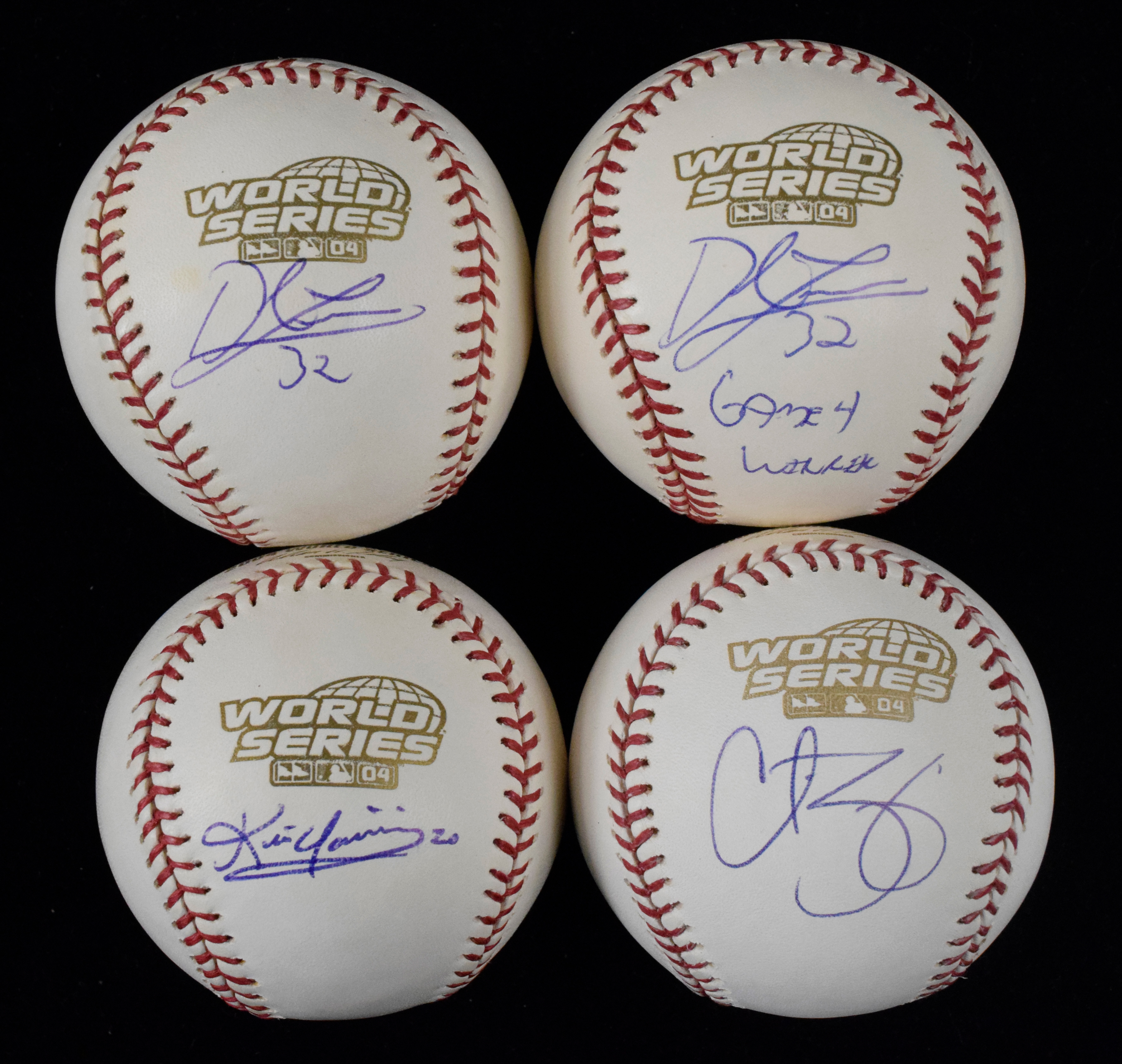 Description:Lot of (7) 2004 WS Boston Red Sox single-signed baseballs with Schilling and Youkilis (Sigs. NM/MT-MT). Each is signed on a B. Selig 2004 World Series baseball. Balls are individually signed by Gabe Kapler, (2) by Derek Lowe (including one with "Game 4 Winner" inscription, Kevin Youkilis, Curt Schilling, Trot Nixon, and Keith Foulke. Signatures rate 8/9 out of 10, and balls have little to no wear: NM-NM/MT.