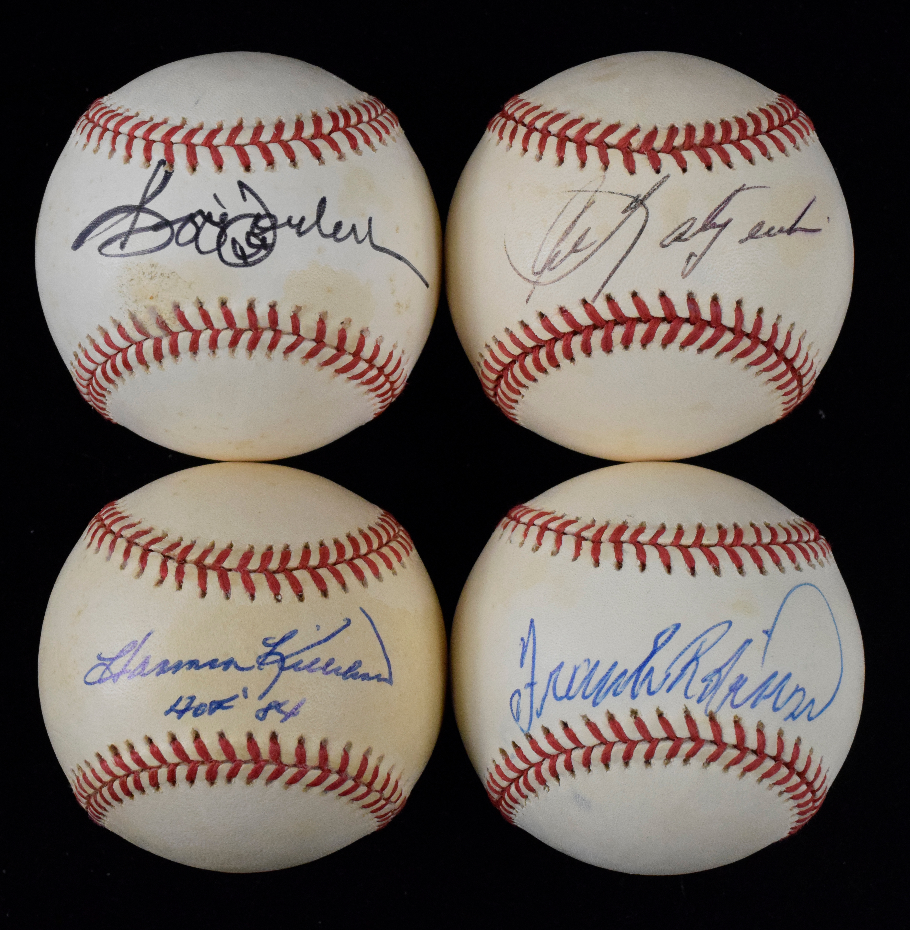 Description:Lot of (5) HOFer-autographed baseballs, with Killebrew, Robinson and Yaz (Sigs. NM/MT-MT). Lot includes (3) G. Budig A.L. baseballs, individually signed by Frank Robinson, Harmon Killebrew with "HOF 84" inscription and Reggie Jackson; (1) B. Selig MLB baseball signed by Jim Rice; and (1) B. Brown A.L. baseball signed by Carl Yastrzemski. Signatures rate 8/9 out of 10, and balls have light to moderate toning: VG/EX-NM.