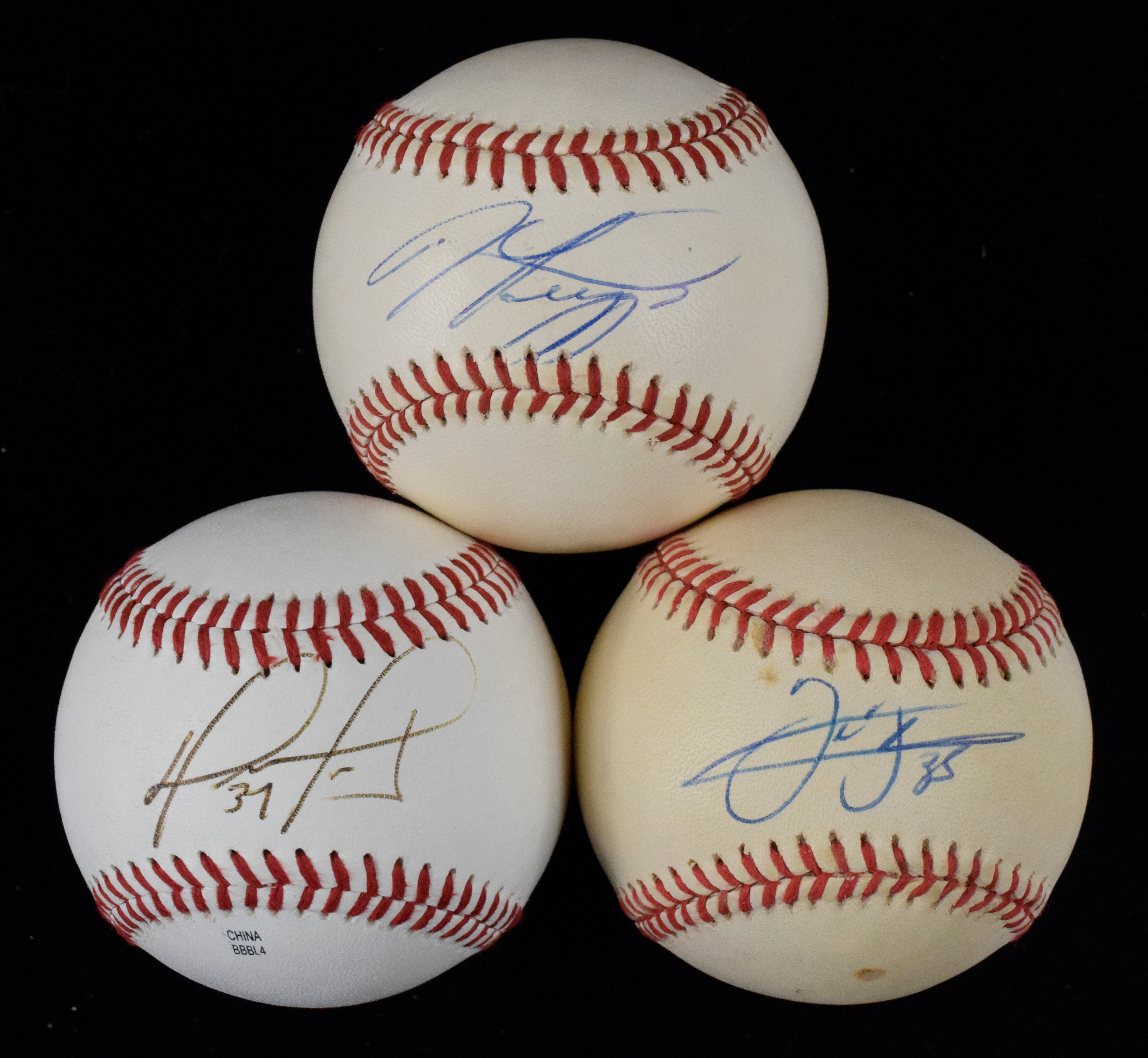 Description:Lot of (3) modern HOFer-autographed baseballs, with Piazza, Thomas and Ortiz (Sigs. NM/MT-MT). Nice assortment of baseballs, each signed on the sweet spot by a Hall of Famer. Includes (1) W. White N.L. ball signed by Mike Piazza; (1) International League ball signed by David Ortiz and (1) G. Budig A.L. ball signed by Frank Thomas. Signatures rate 8/9 out of 10, and balls have light to moderate toning: EX-NM.