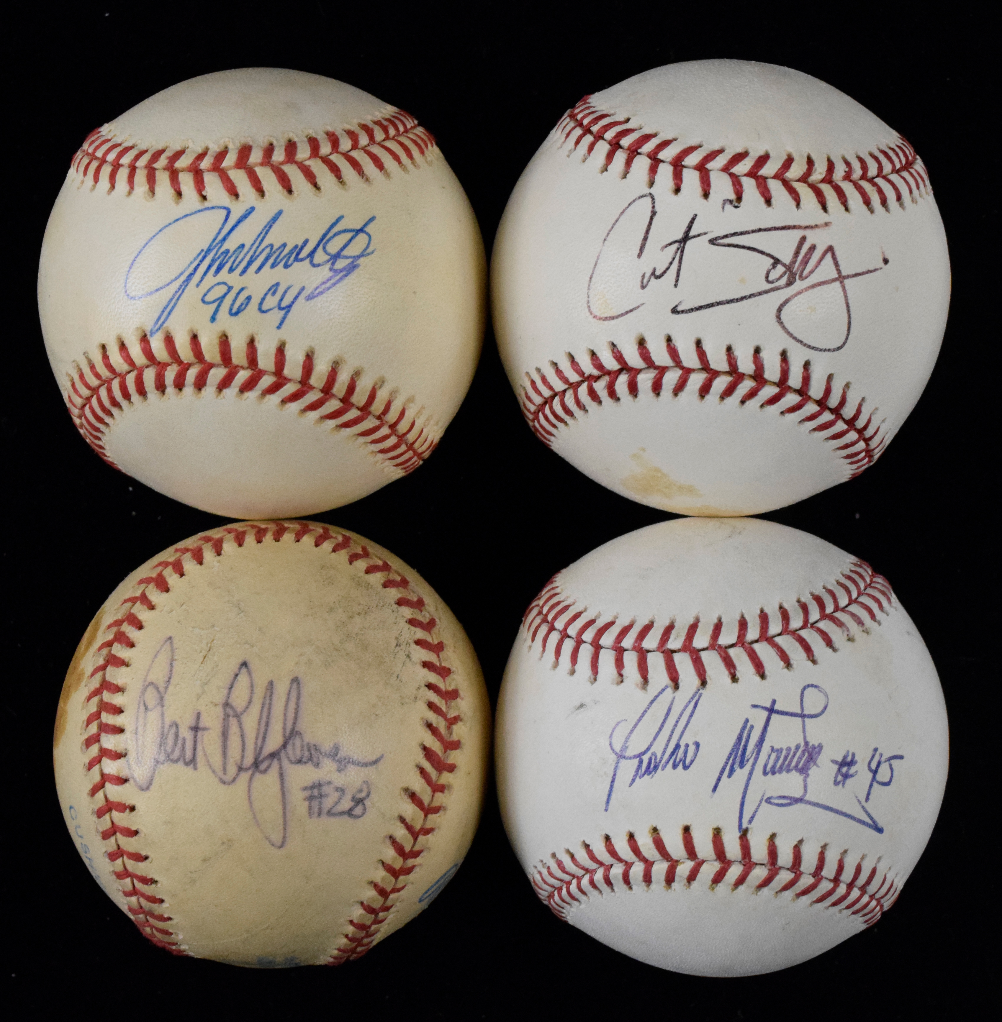 Description:Lot of (8) mostly HOF pitcher autographed baseballs, with Martinez, Blyleven & Smoltz (Sigs. GD-NM). Lot includes (2) B. Selig MLB balls, individually signed by Curt Schilling and Pedro Martinez; (3) G. Budig A.L. balls, individually signed by Luis Tiant, Bert Blyleven and John Smoltz with "96 Cy" inscription; (1) Official League ball signed by Gaylord Perry (signature faded, rating 2 out of 10); (1) Minor League practice ball signed by Rollie Fingers (signature faded/blurred, rating 4 out of 10) and (1) L. Coleman N.L. ball signed by Fergie Jenkins with "HOF 91" inscription (signature faded, rating 5 out of 10). Signatures range from 2 to 9 out of 10, and balls have light to heavy wear/toning: GD-NM.