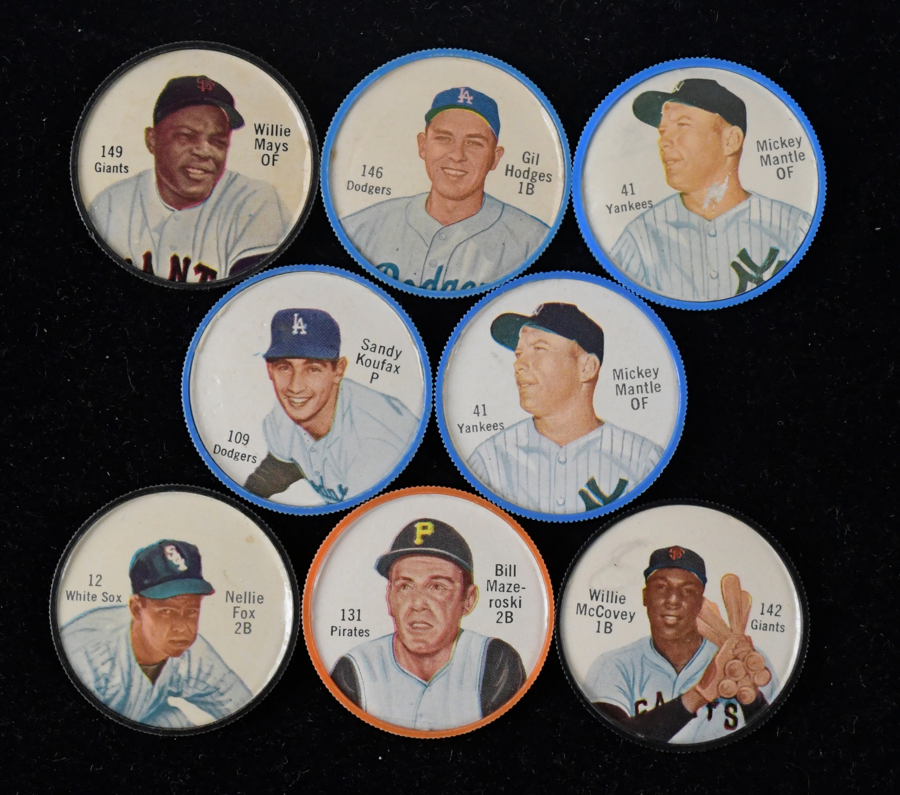Description:Lot of (115) 1962 Salada-Junket Coins with (2) Mickey Mantle, Willie Mays (PR-EX/MT). Good quantity of Salada coins (with light duplication) is highlighted by numerous stars and Hall of Famers, including (2) #41 Mickey Mantle, 142 Willie McCovey, (2) 127 Maury Willis, 71 Luis Aparicio, 12 Nellie Fox, (2) 39 Minnie Minoso, 109 Sandy Koufax, 131 Bill Mazeroski, 72 Norm Cash, 13 Jim Bunning, 146 Gil Hodges, 149 Willie Mays, 72 Norm Cash and more. Most appear VG-VG/EX with some better and some worse. Range: PR-EX/MT. ($400-$600)