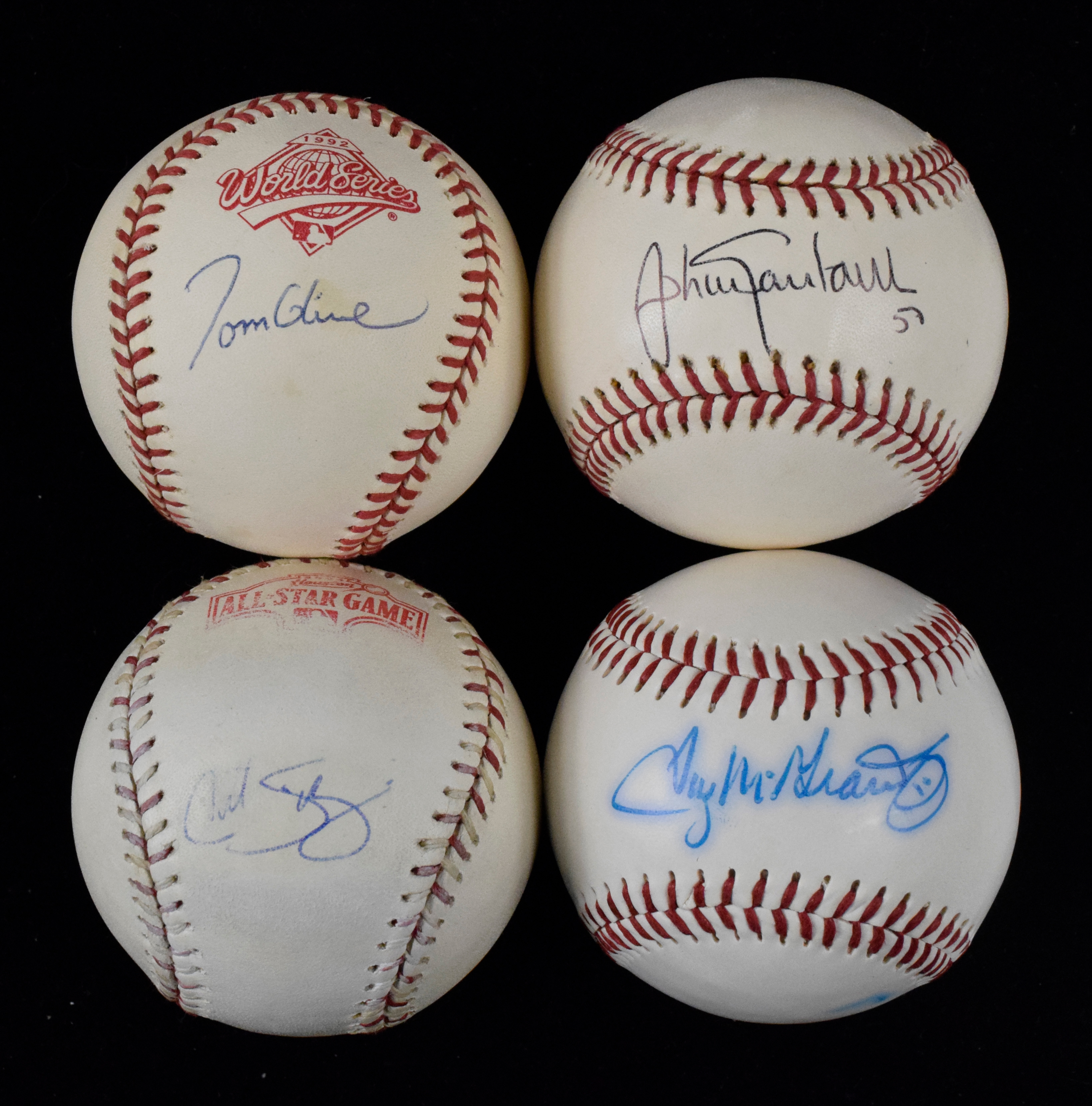 Description:Lot of (8) pitcher autographed baseballs, including Glavine, Santana and Strasburg (Sigs. EX/MT-MT). Lot includes (3) B. Selig MLB balls, individually signed by Stephen Strasburg, Johann Santana, and Bret Saberhagen; (2) G. Budig A.L. balls, individually signed by Fergie Jenkins with "HOF 91" inscription and Derek Lowe; (1) 2004 All-Star Game ball signed by Curt Schilling; (1) Official League ball signed by Tug McGraw; and (1) 1992 World Series ball signed by Tom Glavine. Signatures range from 6 to 9 out of 10 (avg. 7/8), and balls have light to moderate wear/toning: VG/EX-NM.