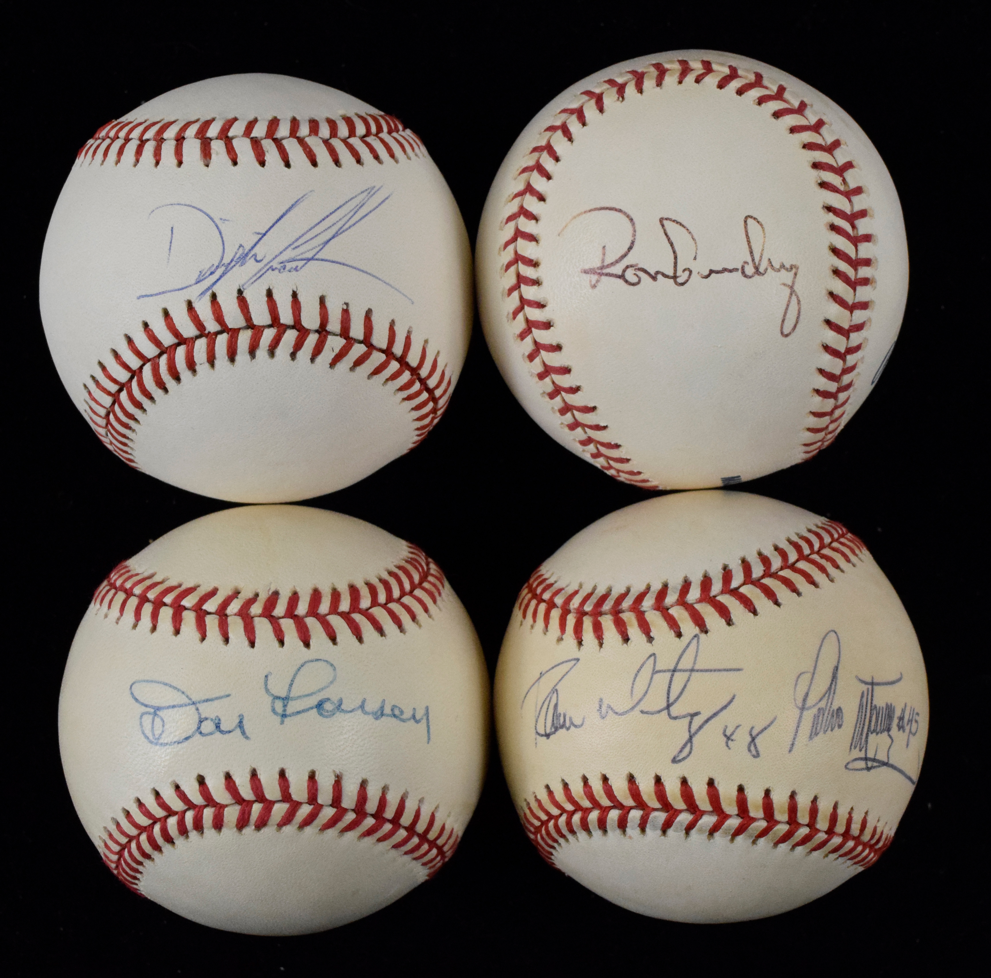 Description:Lot of (9) pitcher autographed baseballs, including Gooden, Martinez and Guidry (Sigs. EX/MT-MT). Lot includes (3) B. Selig MLB balls, individually signed by Ron Guidry, Curt Schilling, and Jon Lester; (4) G. Budig A.L. balls, individually signed by Derek Lowe, Bret Saberhagen, Tom Gordon with "46 sv '98" inscription and Pedro Martinez/Ramon Martinez; and (2) W. White N.L. balls, individually signed by Don Larsen and Dwight Gooden. Signatures range from 6 to 9 out of 10 (avg. 8), and balls have light to moderate wear/toning: VG/EX-NM.