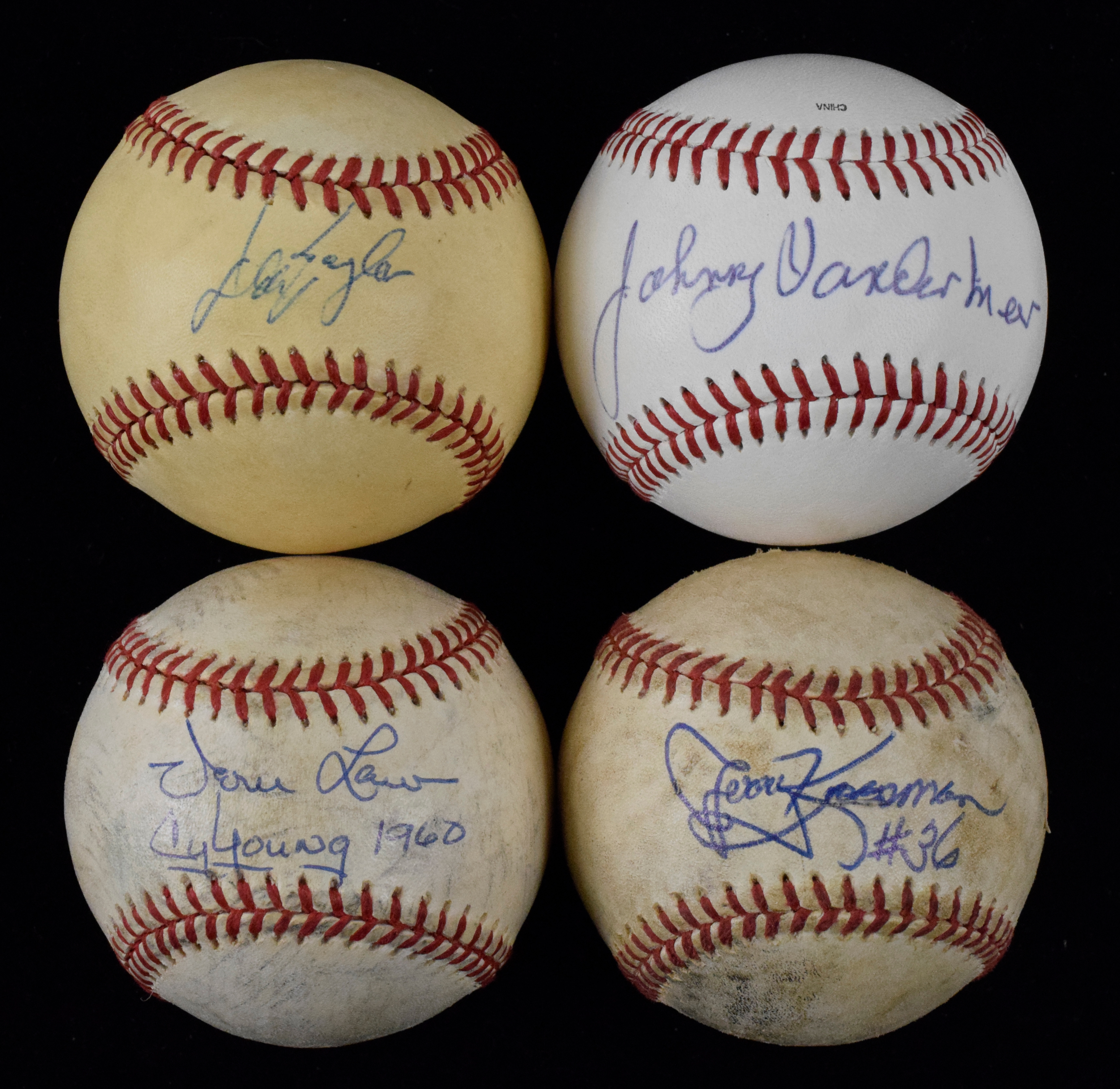 Description:Lot of (11) autographed baseballs, including Vander Meer, Baylor and Koosman (Sigs. EX-MT). Most are signed on official A.L., N.L. or MLB baseballs, with a few others. Balls are individually autographed by Johnny Vander Meer, Don Baylor, Andy Pafko (faded, rating 5 out of 10), (2) Johnny Pesky, Vern Law with "Cy Young 1960" inscription, (2) Jim Mudcat Grant (one faded, rating 5 out of 10, plus another unidentified signature on ball), Al Dark, Jerry Koosman and Gene Tenace with "WS MVP" inscription. Signatures range from 5 (Pafko, Grant) to 9 out of 10 (avg. 7/8), and balls have light to heavy wear/toning: GD-NM.Â