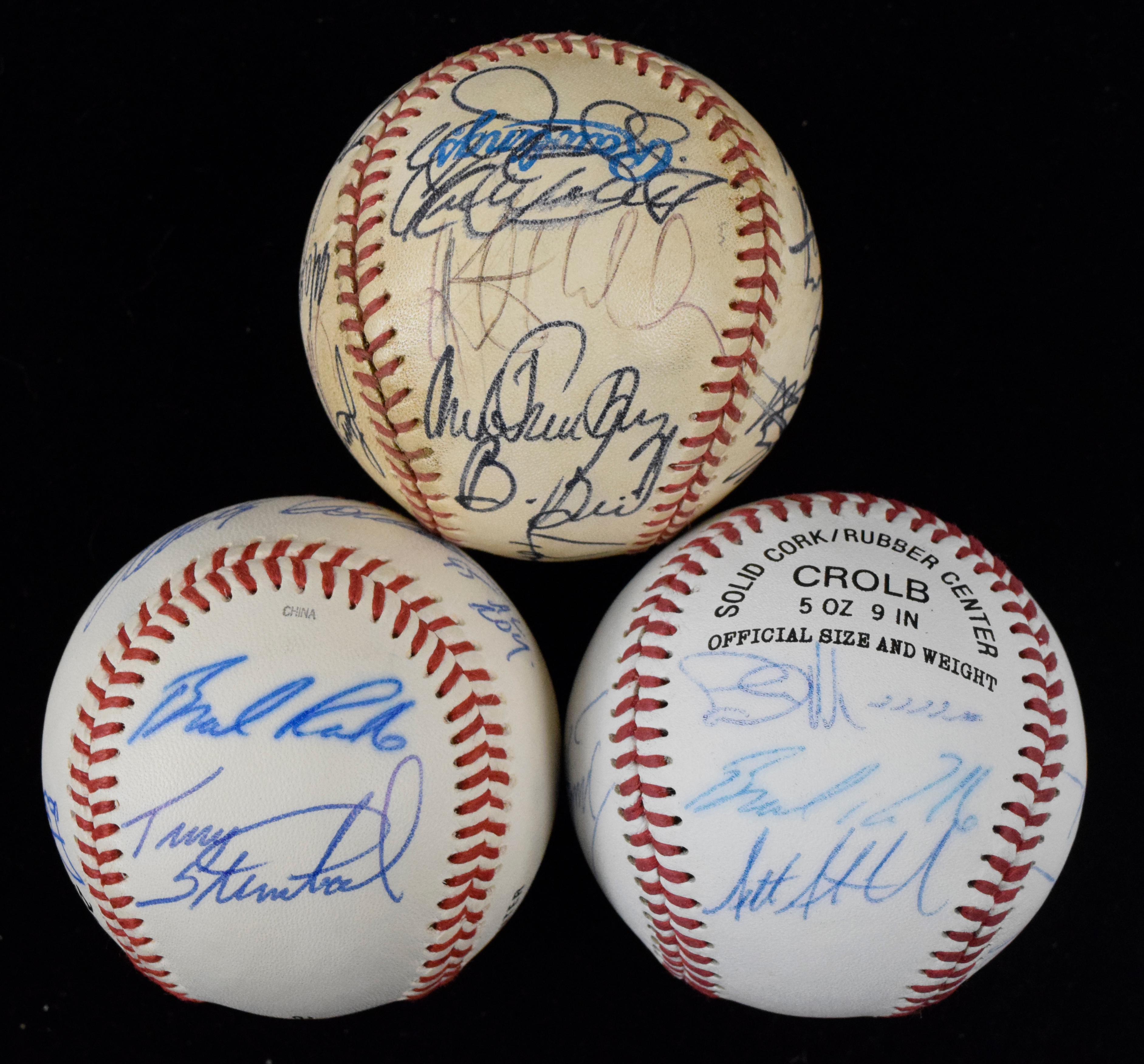 Description:Lot of (3) 1993-1997 Minnesota Twins multi-signed baseballs, with Kirby Puckett (Sigs. EX-MT). Lot includes (1) B. Brown A.L. ball signed by (28) c. 1993 Minnesota Twins, including Kirby Puckett, Tom Kelly, Chuck Knoblauch, Pat Mahomes Sr., Kent Hrbek and others; (1) Official League ball signed by (6) c. 1997 Twins, including Terry Steinbach and Brad Radke; and (1) Official League ball signed by (7) c. 1997 Twins, including Marty Cordova, Brad Radke and Terry Steinbach. Signatures range from 5 to 9 (avg. 7/8) out of 10, and balls have light to moderate toning/wear: EX-NM.
