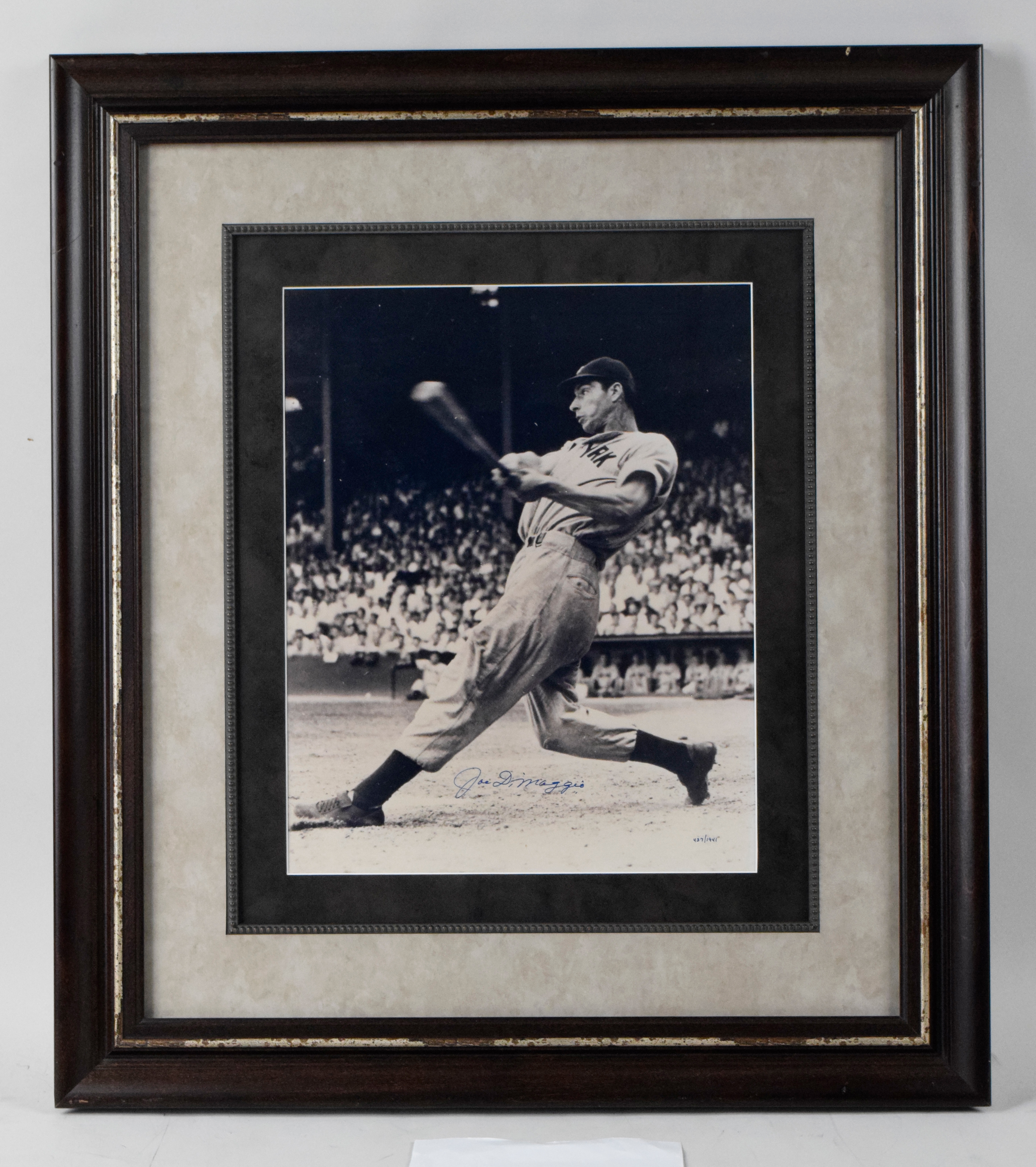 Description:Joe DiMaggio autographed large format limited edition photograph (Sig. MT). Black and white 16"x20" photo has been signed in blue marker by DiMaggio, rating 9/10 out of 10. Hand numbered "437/1941" and framed to 31"x35" for display. Includes auction previous Hunt Auctions LOA. Frame has a few light scratches/dings: EX/MT.