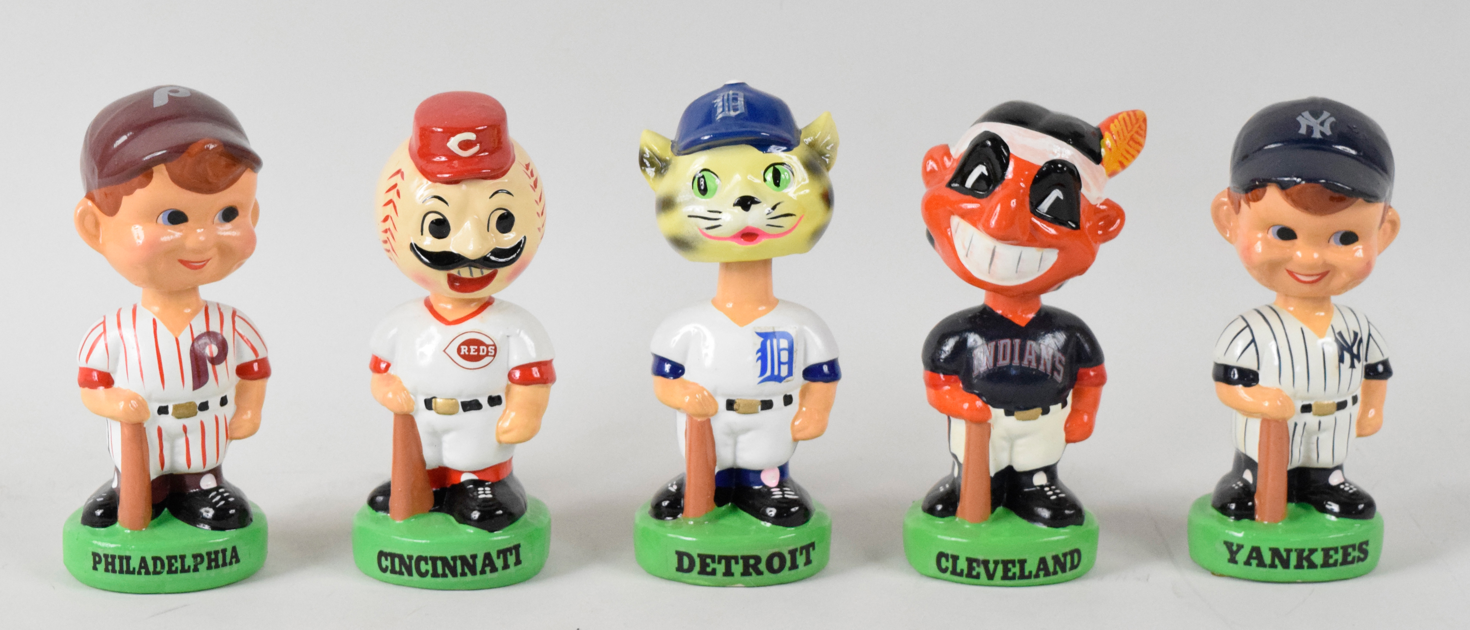 Description:Lot of (16) c. 1980s green base team bobbleheads with Yankees, Chief Wahoo (VG/EX-NM/MT). Well-made assortment of nodders from the 1980s, each with a green base. Includes one each of the following (team name applied to the base): Yankees, Detroit, Philadelphia, Cleveland (Chief Wahoo mascot), Cincinnati, San Francisco, Seattle, California, Atlanta, Oakland, Milwaukee, Houston, Montreal, St. Louis, Pittsburgh and Chicago. Most are high-grade (EX/MT-NM) with a few lesser due to small chips or hairline cracks. Full range: VG/EX-NM/MT.