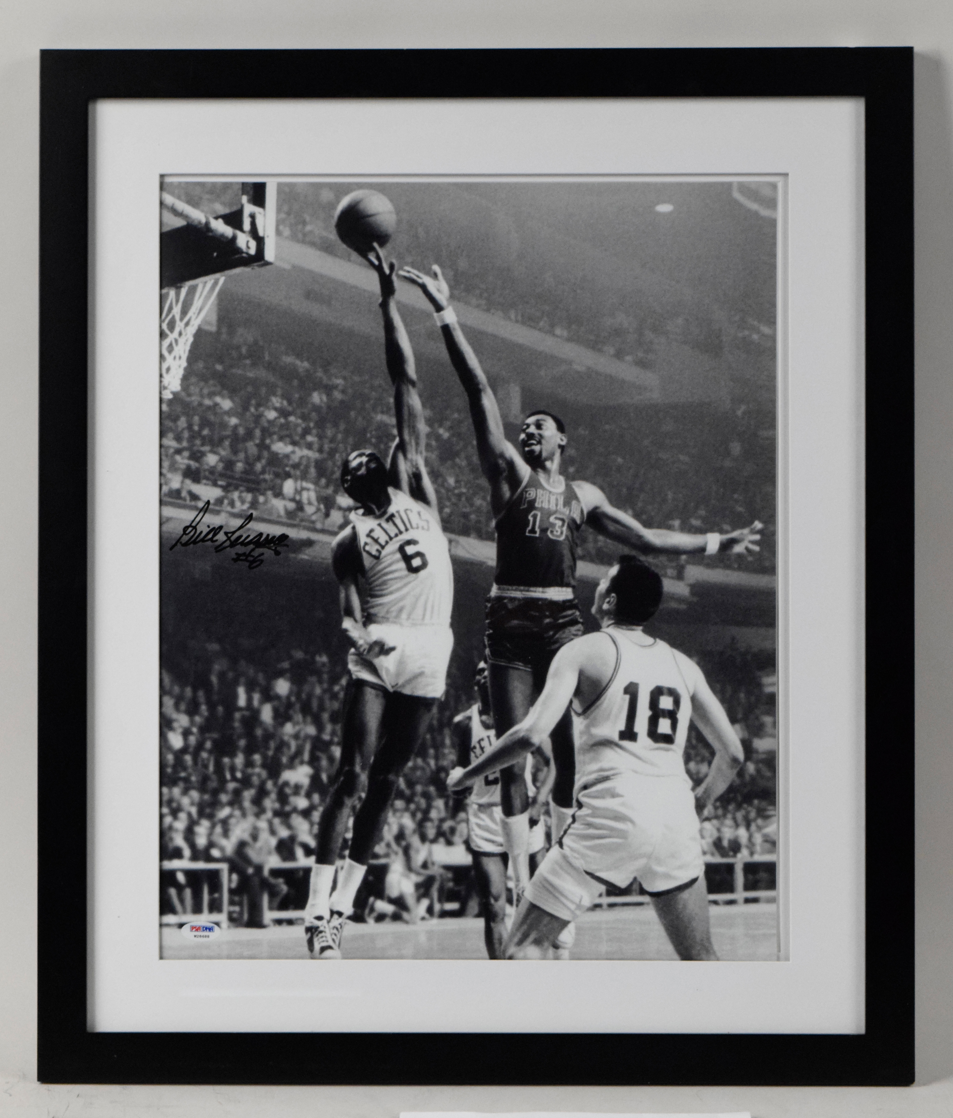 Description:Large Bill Russell framed and autographed photo with PSA/DNA cert (Sig. MT). 16"x20" photo has been signed in black marker by Bill Russell with "#6" inscription, rating 9/10 out of 10. A PSA/DNA authentication sticker is affixed to the lower left, and a basic cert is also included. Photo is framed to 22"x26," but is loose in the frame: EX/MT.