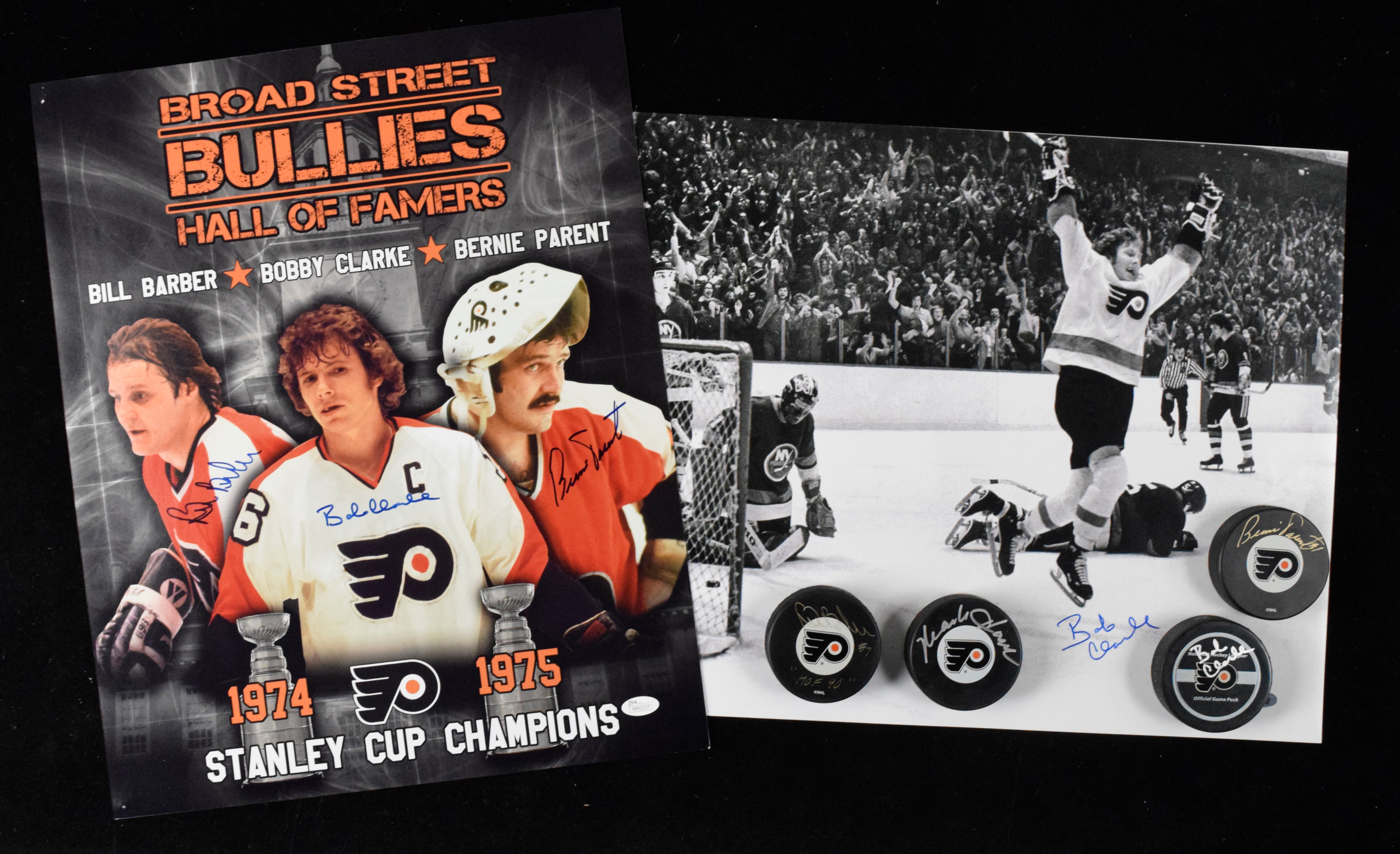 Description:Lot of (6) Philadelphia Flyers autographed pucks and photo, with Parent and Clarke (Sigs. NM/MT-MT). Lot includes (4) Flyers logo hockey pucks, individually autographed by Bobby Clarke, Mark Howe, Bernie Parent and Bill Barber. Also includes (2) 16"x20" photos, with one autographed by Bobby Clarke and one autographed by Bill Barber, Bobby Clarke and Bernie Parent (with JSA sticker). Signatures rate 8/9 out of 10, and items appear EX/MT-NM.