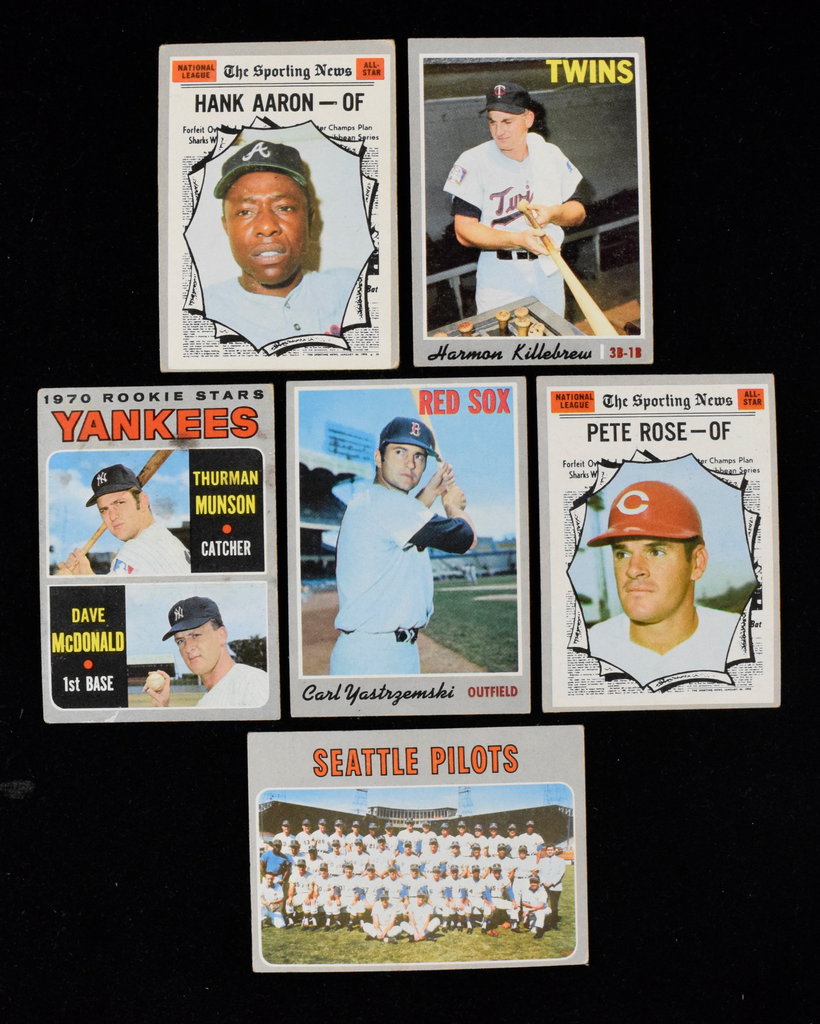 Description:Lot of (500+) 1970 Topps cards with high numbers & stars, Munson RC (PR-EX). Excellent quantity of 1970 Topps cards (with duplication plus one Scatch-Off) is sorted in team order with low, semi-high and high numbers throughout. Highlights include #s 1 Mets team, 394 Gil Hodges, 403 Jim Bunning, 470 Willie Stargell, 622 Don Sutton, 210 Juan Marichal, 17 Hoyt Wilhelm, 537 Joe Morgan, 189 Thurman Munson RC (PR), 10 Carl Yastrzemski, 230 Brooks Robinson, 502 Rollie Fingers, 150 Harmon Killebrew, 315 Luis Aparicio, 713 Pilots team, 453 Rod Carew AS, 455 Brooks Robinson AS, 458 Pete Rose AS, 463 Frank Robinson AS, 462 Hank Aaron AS, 461 Carl Yastzemski AS, (3) 459 Reggie Jackson AS and more. Most cards appear VG/EX with some better and some worse, though many of the stars are on the lower end of the condition scale. Range: PR-EX.
