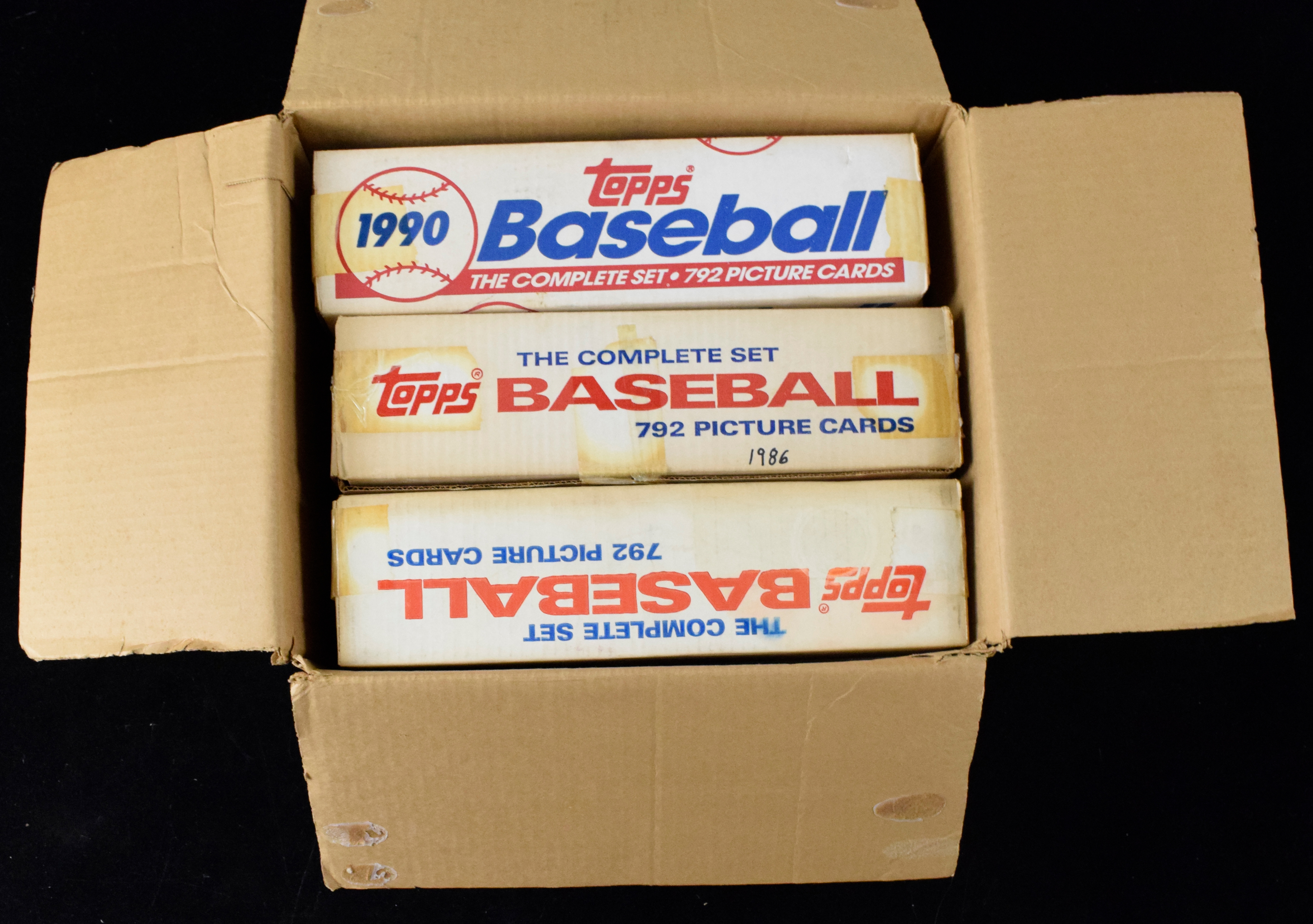 Description:Lot of (9) 1986-1992 Topps factory sets with most sealed (Boxes: EX). All sets are white box and remain factory-sealed unless otherwise noted. Includes (1) 1986 (seal broken), (2) 1987, (2) 1990, (2) 1991 (both have broken seals) and (2) 1992. Boxes show shelf wear (EX), with all cards presumably NM/MT-MT or better condition.