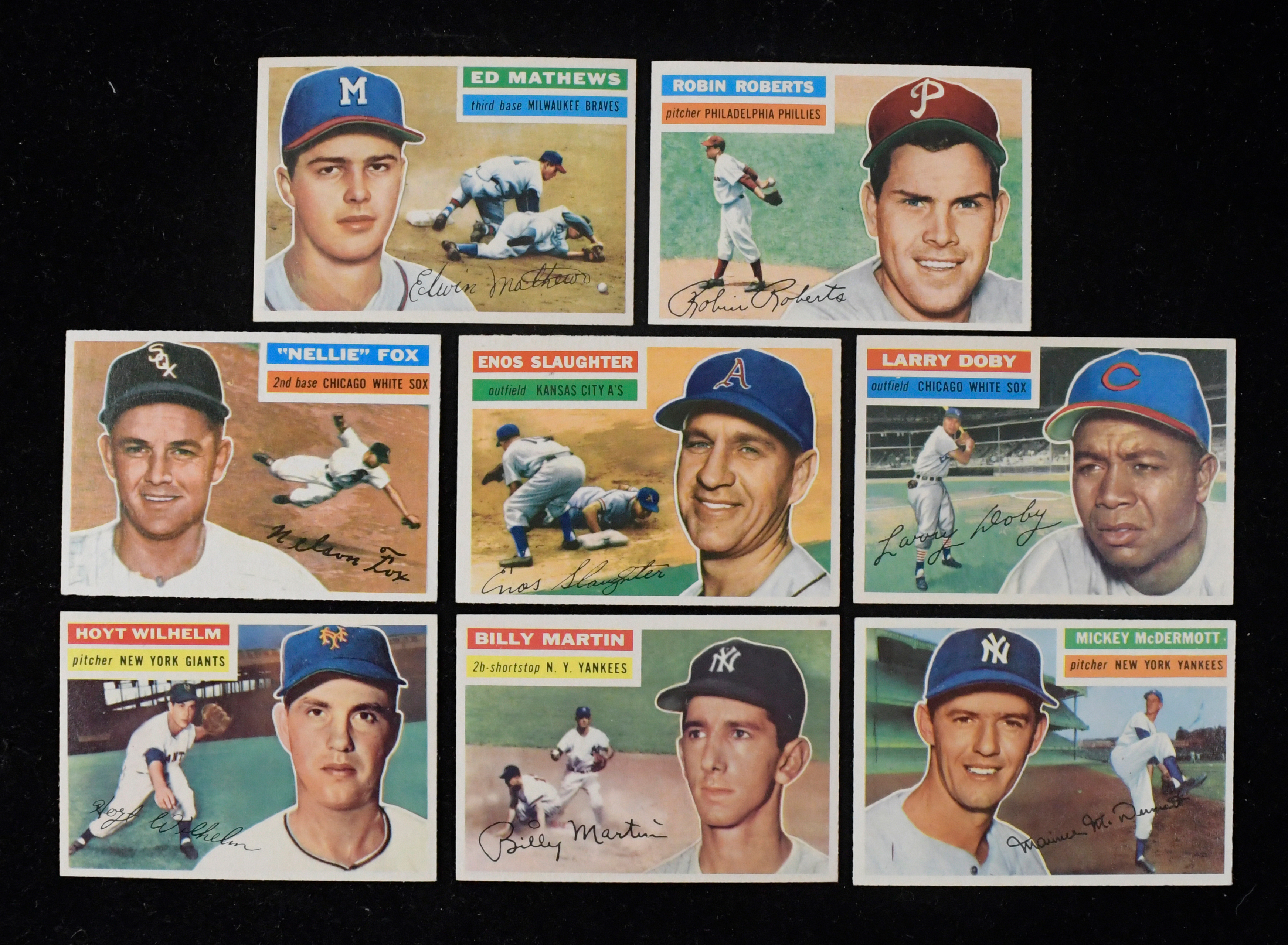 Description:High-grade 1956 Topps partial set (154/340) with HOFers, including Mathews & Fox (EX-NM/MT). Crisp partial set offers (154) different cards of the (340) issued. Lot (with mixture of gray and white backs) includes primarily commons and minor stars, with some Hall of Famers but high-value cards/major stars removed. Highlights include #s 107 Eddie Mathews gray back (EX/MT), 109 Enos Slaughter gray back (NM), 118 Nellie Fox gray back (EX/MT), 181 Billy Martin (NM), 180 Robin Roberts (EX/MT), 250 Larry Doby (EX/MT), 307 Hoyt Wilhelm (EX/MT), 340 Mickey McDermott (EX) and more. Partial set appears mostly EX/MT-NM (including many with nice centering) with some less. Range: EX-NM/MT. ($750-$1,000)