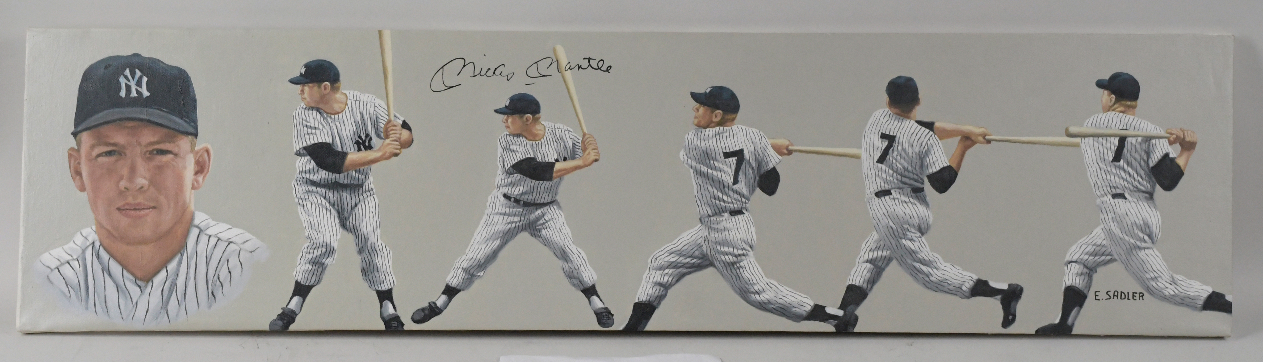 Description:Mickey Mantle autographed panoramic painting also signed by artist Erwin Sadler (NM). 12"x48" canvas painting signed by Mantle in black marker. Signature rates 8 out of 10. Signed by Erwin Sadler at the bottom right corner: NM ($750-$1,000)