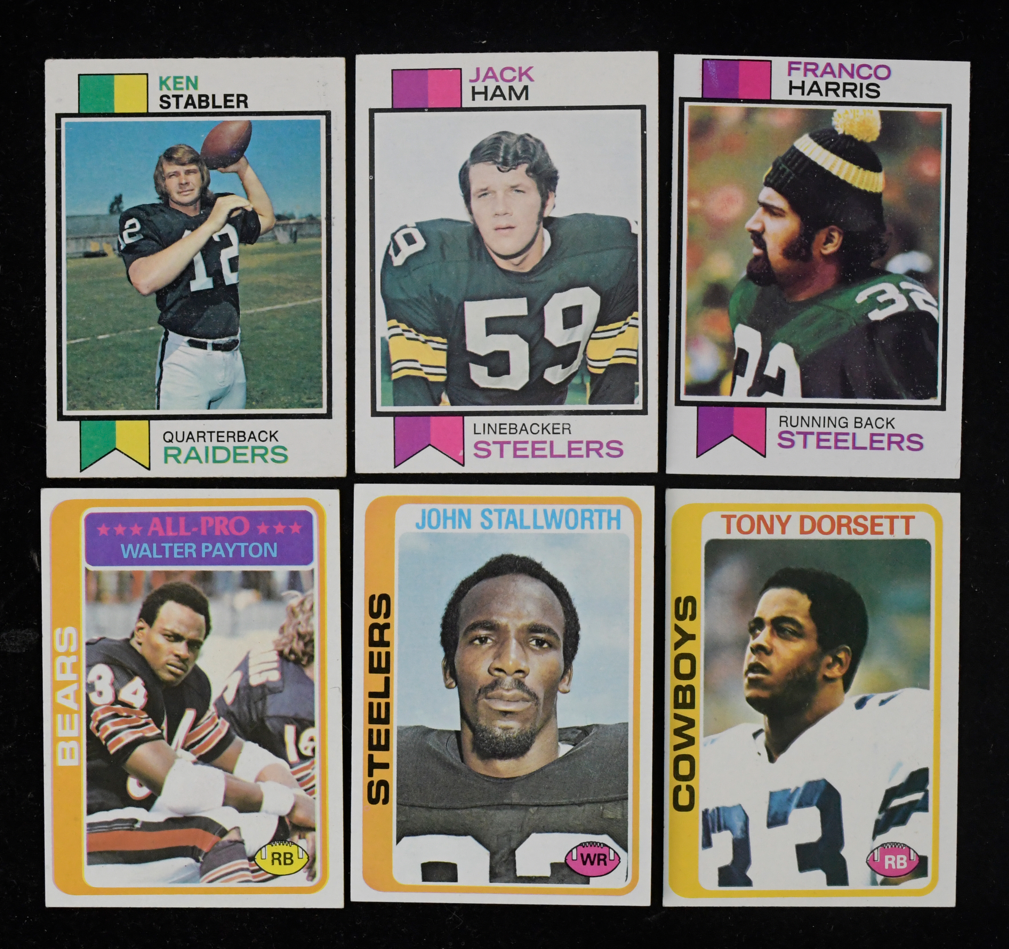 Description:Lot of (2) Topps FB complete and near-complete sets, with 1973 and 1978 (PR-NM). Lot includes (1) 1973 Topps complete set, highlighted by the rookie cards of #89 Franco Harris (NM OC), 115 Jack Ham (EX) and 487 Ken Stabler (VG/EX); and (1) 1978 Topps near-complete set (missing 2 commons), highlighted by the rookie cards of #315 Tony Dorsett (VG/EX OC) and 320 John Stallworth (VG/EX). Balance of the cards in both sets appear mostly VG/EX-EX with some better and some worse. Range: PR-NM.