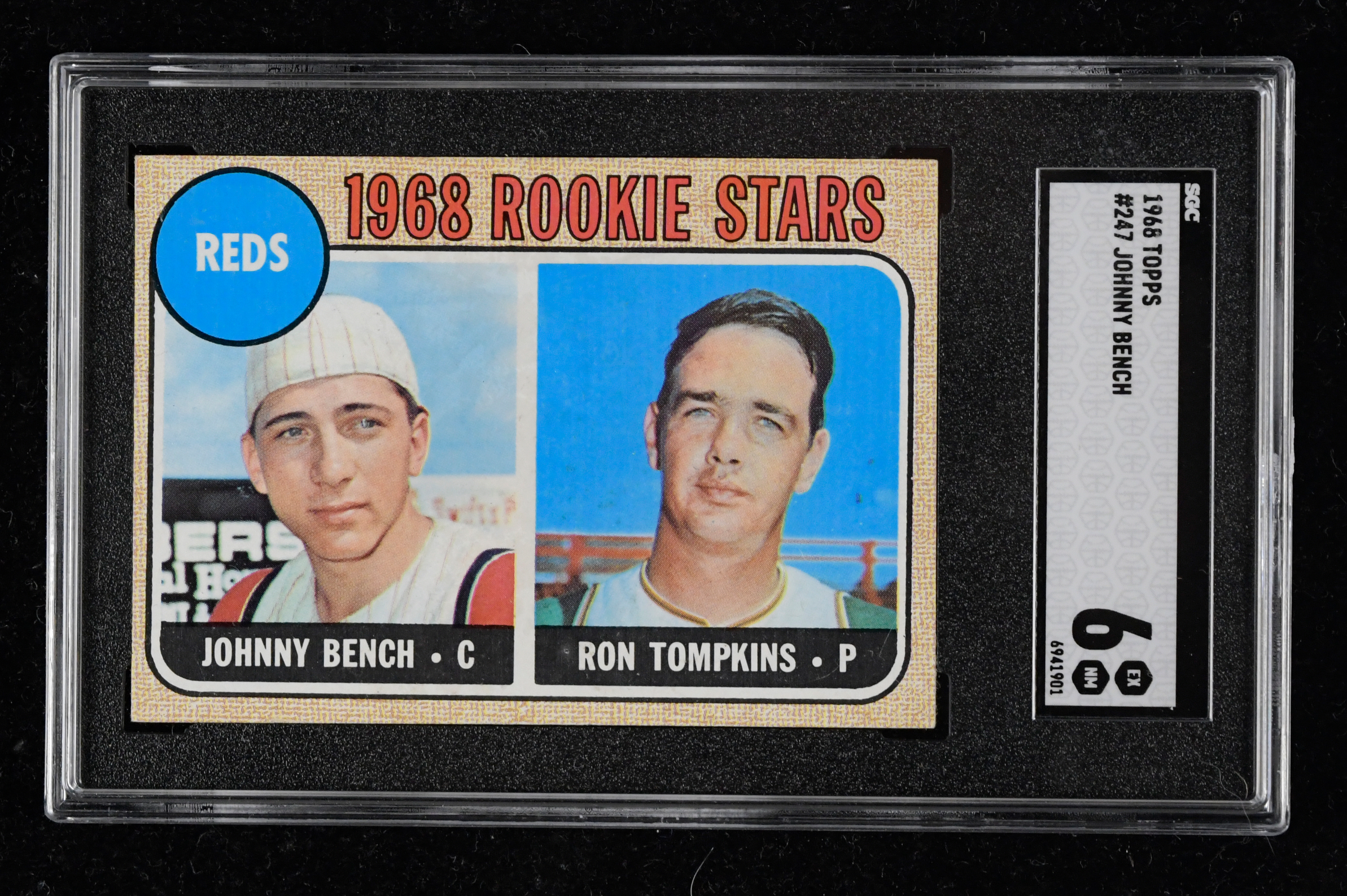 Description:1968 Topps #247 Johnny Bench RC (SGC 6 EX/MT). Key rookie card in the 1968 Topps set is centered slightly to the top with light corner wear and vibrant color. Back is clean: SGC 6 EX/MT.