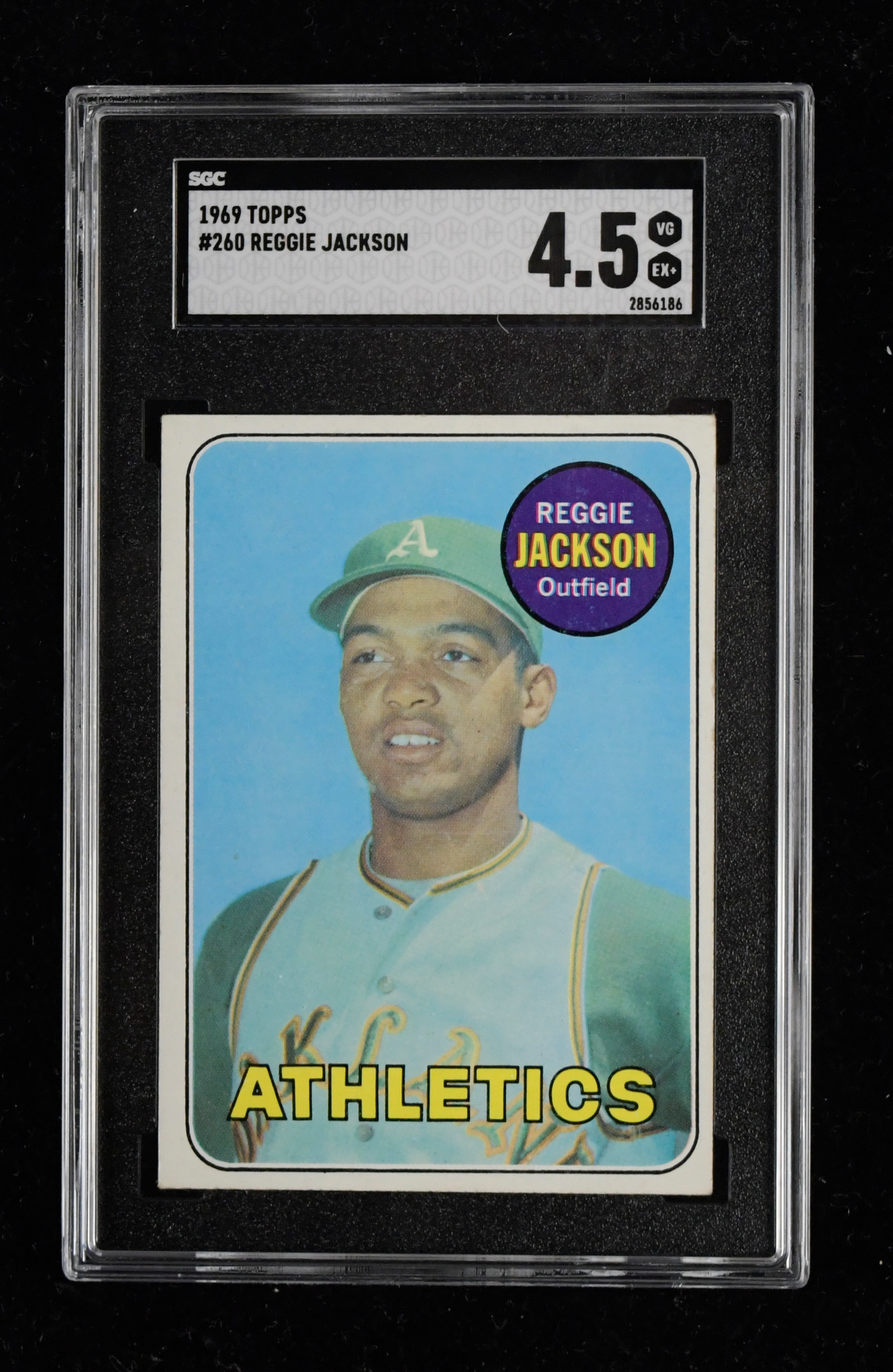 Description:1969 Topps #260 Reggie Jackson RC (SGC 4.5 VG/EX+). Key rookie card in the 1969 Topps set is centered to the right with moderate wear to all four corners. Back is clean: SGC 4.5 VG/EX+.