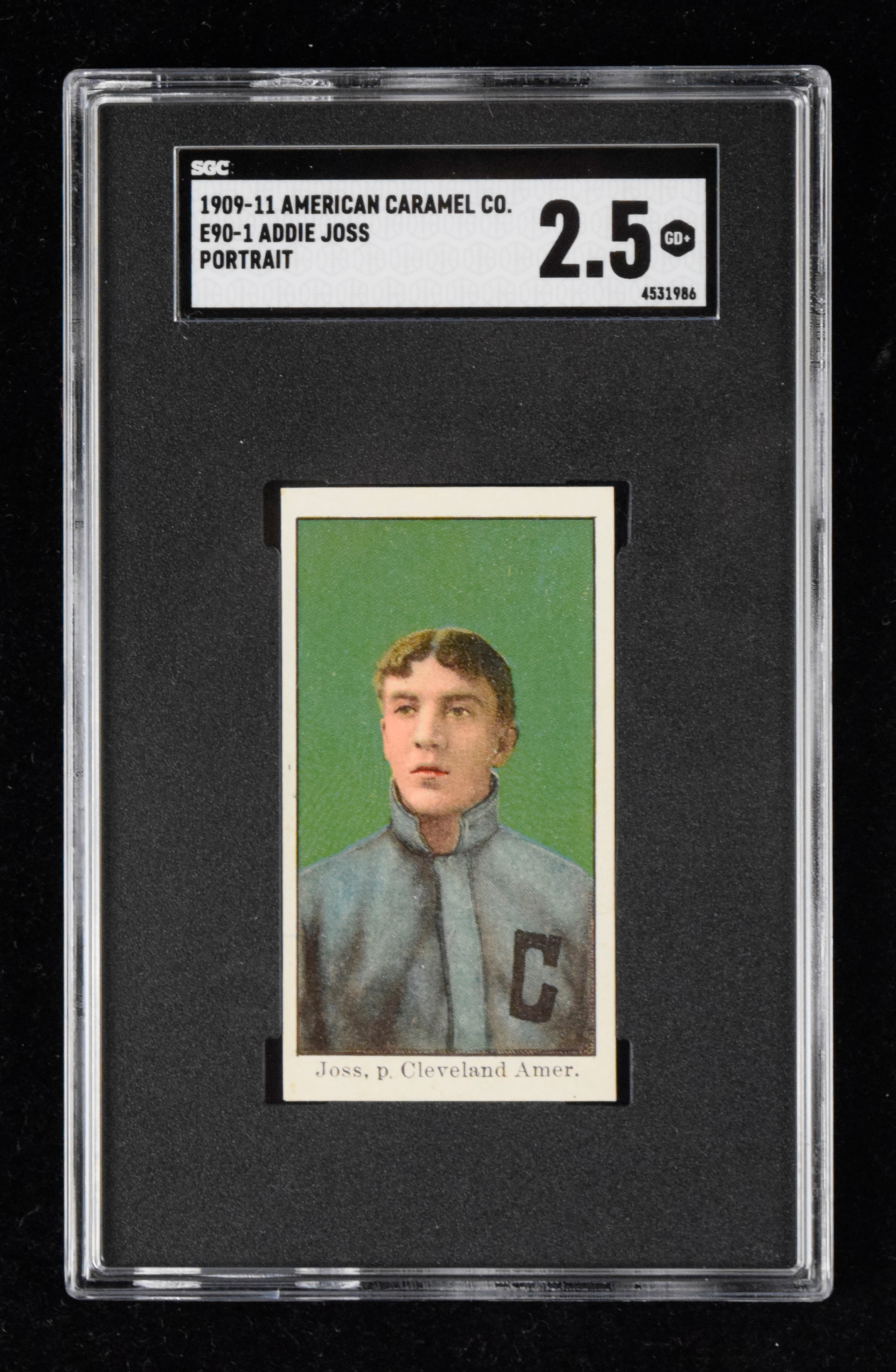 Description:1909-11 E90-1 Addie Joss (Portrait) (SGC 2.5 GD+ - exceptional eye appeal) Hall of Famer shown in classic pose which is vibrant and well centered. Corners and edges are crisp and what one would more commonly associate with a card in far higher grade. Some spotting/discoloration on the back accounts for technical downgrade: SGC 2.5 GD+ ($400-$600)