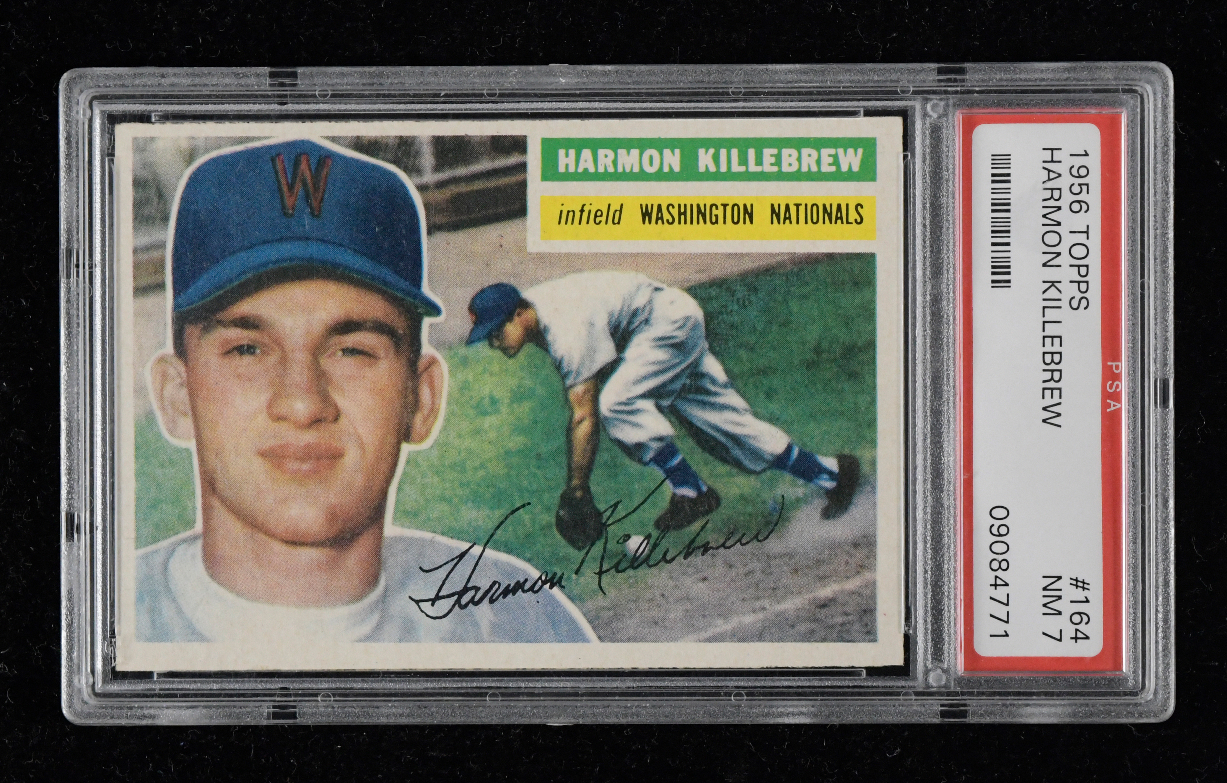 Description:1956 Topps #164 Harmon Killebrew gray back (PSA 7 NM). Clean 2nd-year card of the Hall of Famer is centered to the top with four strong corners, vibrant color and perfect registration. Back is clean: PSA 7 NM.