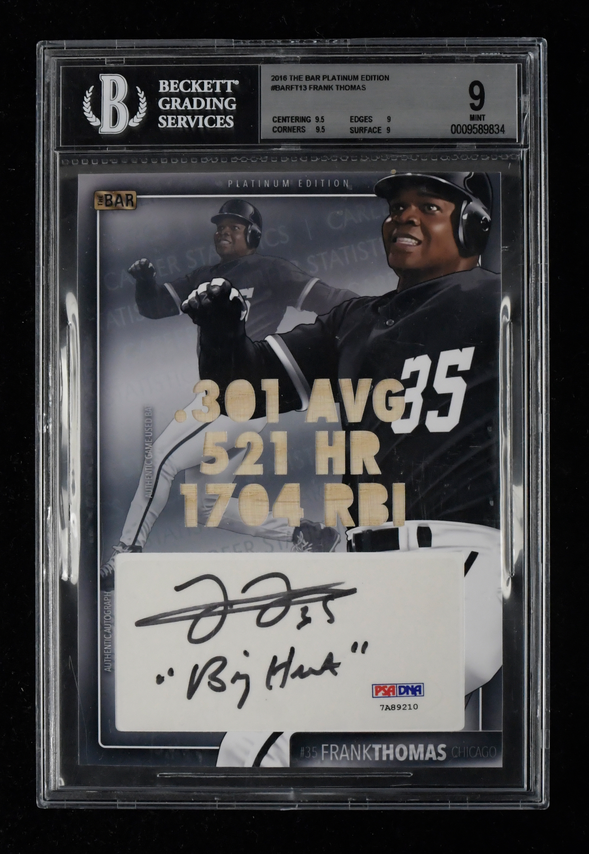 Description:2016 Bar Platinum Edition Frank Thomas cut signature, game-used bat card (BGS 9 MT; Auto: 10). Oversize card features pieces of a game-used bat, as well as a cut signature of Frank Thomas with "Big Hurt" inscription. Signature has been authenticated by PSA/DNA, and card has been graded and encapsulated by Beckett with card grade of 9 and auto grade of 10.