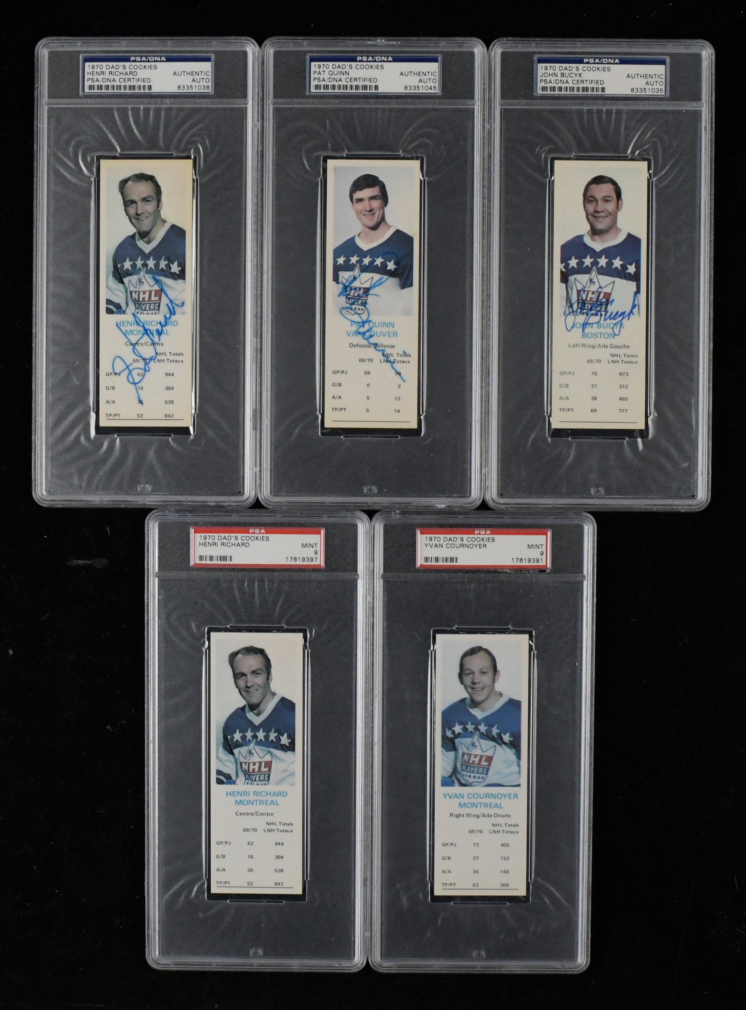 Description:Lot of (5) PSA-graded 1970 Dad's Cookies hockey cards, including (3) autographed (NM-MT). Lot includes (2) cards graded PSA 9 MT: Yvan Cournoyer and Henri Richard and (3) authenticated and encapsulated by PSA/DNA with "Authentic Auto" grades: Henri Richard, Pat Quinn and John Bucyk. Signatures rae 8/9 out of 10, and cards appear NM-NM/MT. Range: NM-MT.