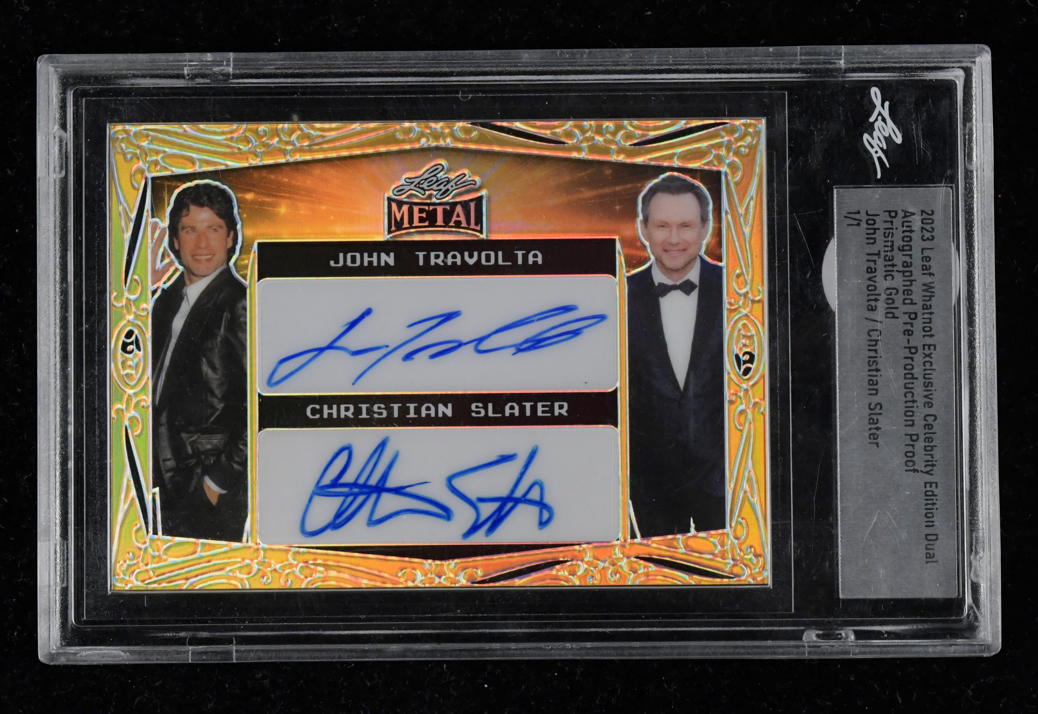 Description:2023 Leaf Metal Celebrity Edition John Travolta & Christian Slater dual signed card (Sigs. MT). 1/1 Whatnot Exclusive Prismatic Gold pre-production proof card has been signed by actors John Travolta and Christian Slater, rating 9 out of 10. Card, which has been encapsulated by Leaf, appears MT.