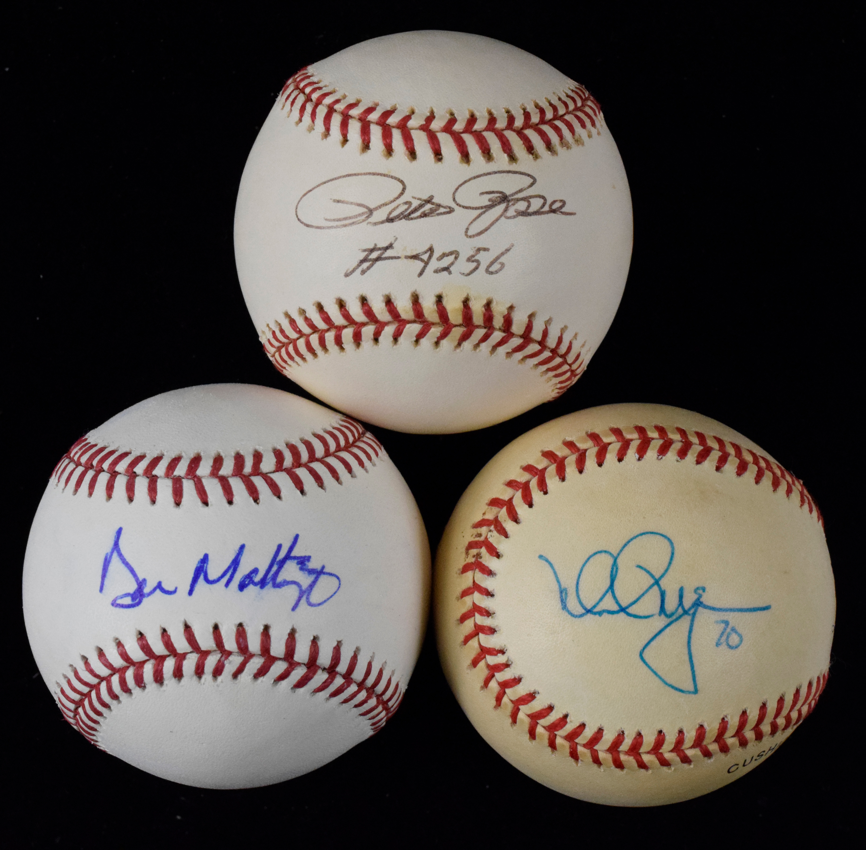 Description:Pete Rose, Mark McGwire, and Don Mattingly signed baseballs (EX-NM/MT). Includes L.Coleman NL ball (light toning) signed by Pete Rose with "#4256" inscription, L.Coleman NL ball (toning) signed by Mark McGwire with "70" inscription, and 2016 Spring Training ball signed by Don Mattingly. Signatures rate 7 to 8/9 out of 10: EX-NM/MT