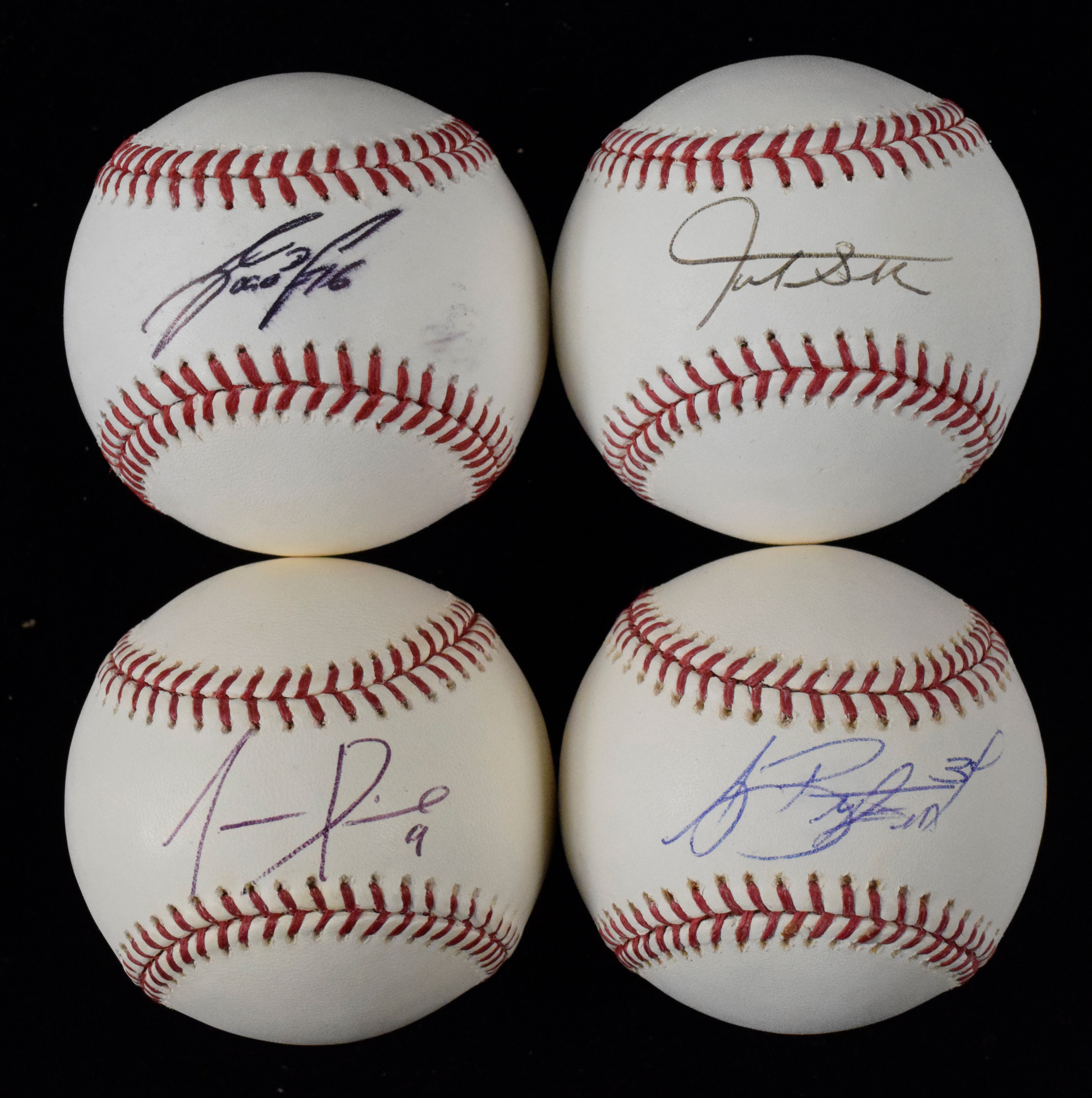 Description:Jose Fernandez, Giancarlo Stanton, Juan Pierre, A.J. Burnett signed baseballs (EX-NM/MT). All are signed on the sweet spot of B.Selig ML balls. Stanton is MLB Authenticated. Signatures rate 7 to 8 out of 10. Fernandez ball has a surface smudge near the bottom right corner of his autograph: EX-NM/MT