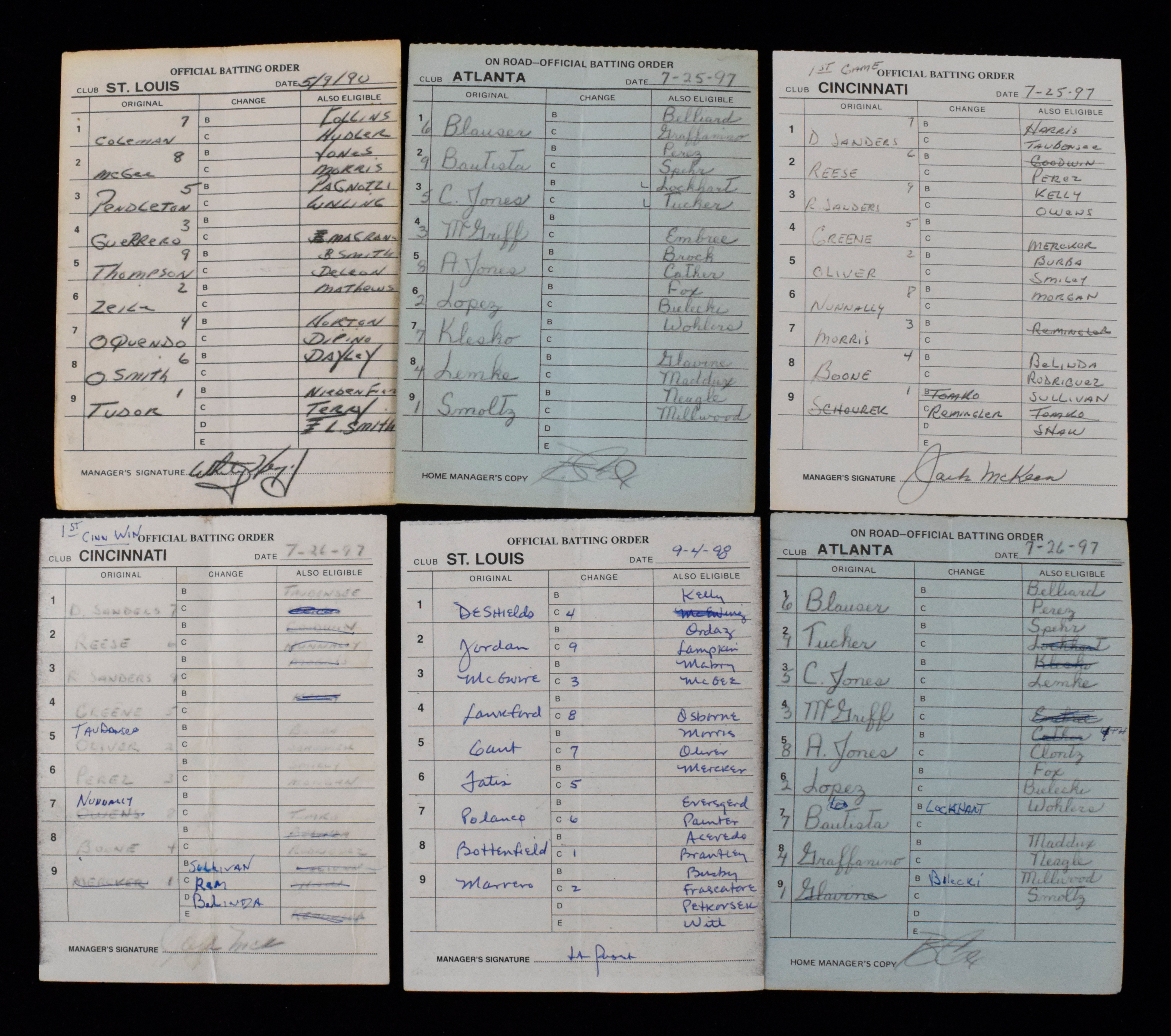 Description:Lot of (17) MLB batting order cards from 1990-2000 (VG-VG/EX). Includes 5/9/1990 St. Louis Cardinals carbon copy; 7/25/1997 Cincinnati Reds signed by Jack McKeon; 7/25/1997 Atlanta Braves carbon copy (John Smoltz CG win and HRs by Fred McGriff, Chipper Jones, and Andruw Jones); 7/26/1997 Reds and Braves carbon copies; 9/4/1998 Cardinals signed by Tony LaRussa; 9/4/1998 Reds unsigned; 9/6/1998 Reds signed by Jack McKeon; 9/6/1998 Cardinals carbon copy; 9/9/1998 Reds and Cardinals carbon copies; 9/10/1998 Reds and Cardinals carbon copies; 9/20/1998 Reds unsigned; 9/20/1998 Chicago Cubs carbon copy; 10/1/2000 Reds signed by Jack McKeon; and 10/1/2000 Cardinals carbon copy. Normal handling wear including creases: VG-VG/EX