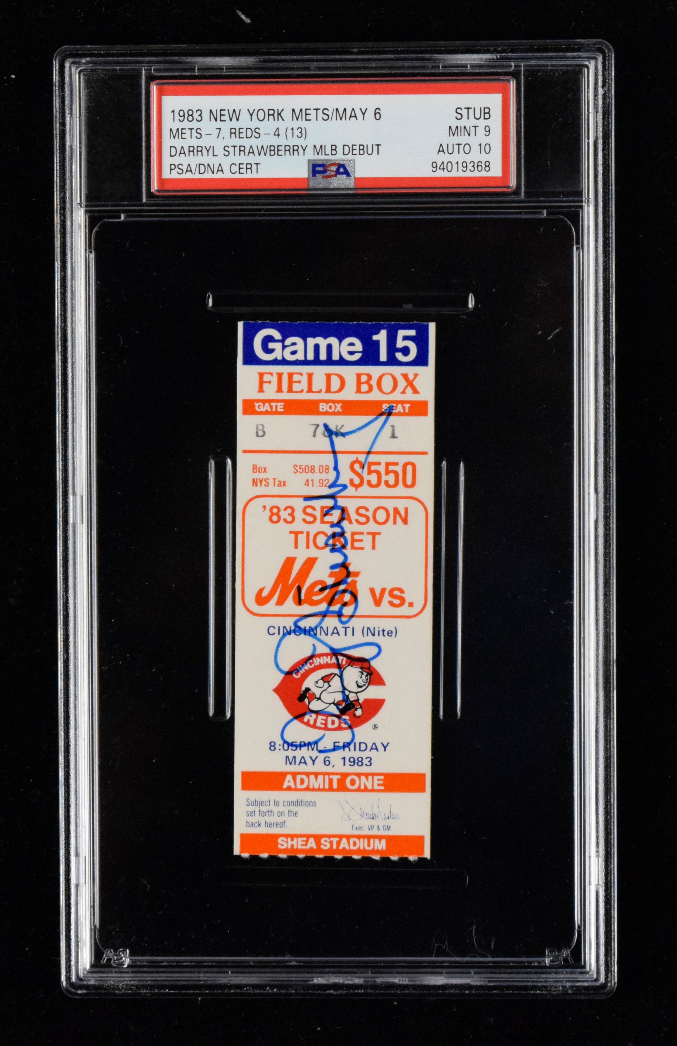 Description:May 6, 1983 Darryl Strawberry autographed debut game ticket stub (PSA Mint 9 with "10" autograph - highest graded) Original ticket stub issued for the game in which he made his MLB debut has been signed "Darryl Strawberry" across the front in marker. There are none graded higher: PSA Mint 9 with 10 autograph ($1,000-$1,500)