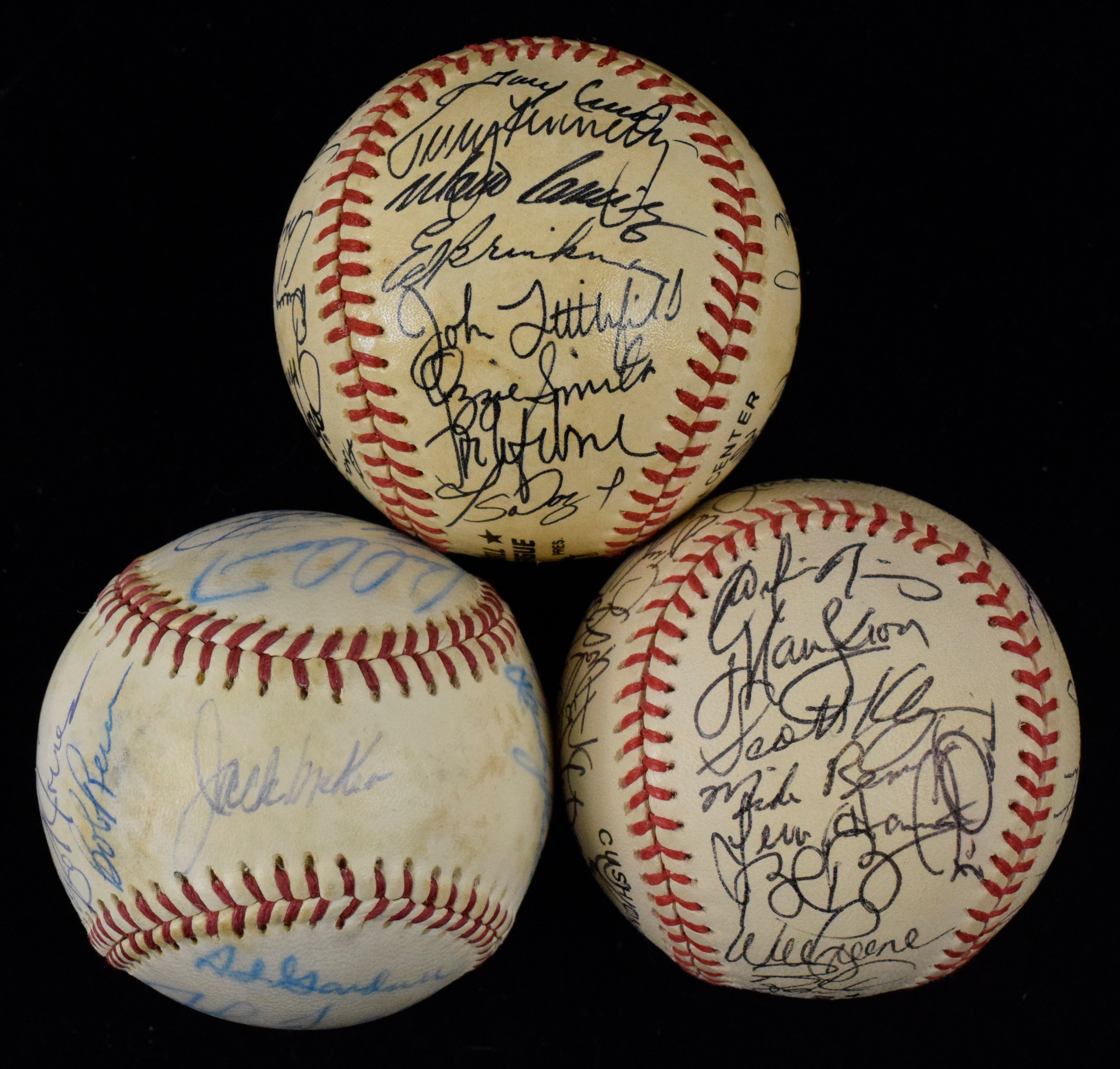 Description:1979 Denver Bears, 1981 San Diego Padres, and 1998 Cincinnati Reds team signed baseballs (VG-EX). Includes a Wilson official American Association ball signed by (19) members of the 1979 Denver Bears: Jack McKeon, Dave Campbell, Tony Bernazard, Pat Scanlon, Norm Angelini, Randy Bass, Jamie Easterly, Art Gardner, Bob James, Randy Miller, Bob Pate, Steve Ratzer, Bob Reece, and others (VG-VG/EX); C.Feeney NL ball signed by (30) members of the 1981 Padres: Frank Howard, Ozzie Smith, Terry Kennedy, Gene Richards, Ruppert Jones, Gary Lucas, Joe Lefebvre, Luis Salazar, John Urrea, Don Boone, Chris Welsh, Juan Eichelberger, Juan Bonilla, and others (VG/EX); and L.Coleman NL ball signed by (33) members of the 1998 Reds: Jack McKeon, Barry Larkin, Bret Boone, Pete Harnisch, Reggie Sanders, Willie Greene, Jeff Shaw, Dmitri Young, Ed Taubensee, Danny Graves, Pokey Reese, Stan Belinda, Brett Tomko, Chris Stynes, and others (EX). Signatures rate 6/7 to 9/10 (avg 8) out of 10: VG-EX